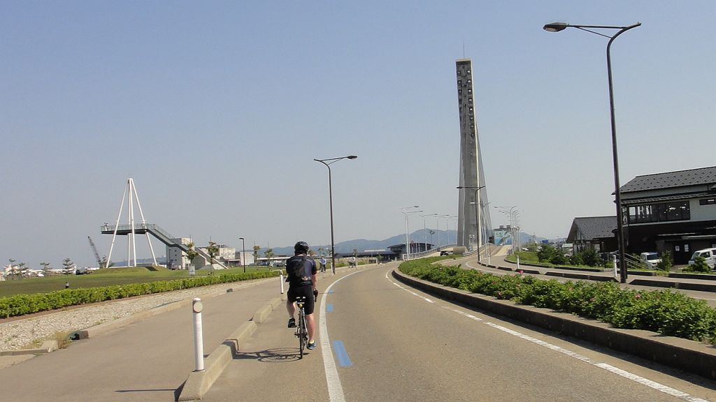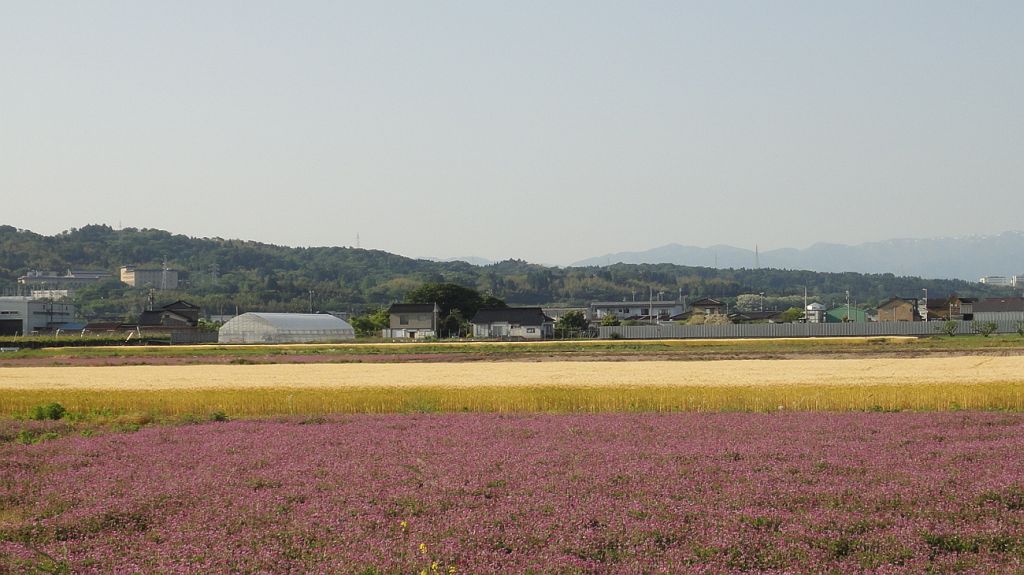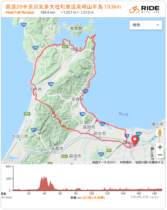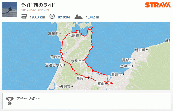 県道29千里浜気多大社和倉温泉崎山半島 193km 2017年5月20日 二週連続土曜に走れず今週ようやく土曜が晴れ、行くしかないでしょうとロングライド決行で、6時半出発。今季は乗り始めが遅かったのでちょっと欲張ってしまった。西に向かう定番ルートで呉羽小杉大門高岡、見事な麦秋やレンゲの花にヒバリの声、春は去り完全に初夏となった。国吉ローソンで1回目の補給休憩。県道29に入り、広谷川沿いの坂に取り付く、川上からカワセミが飛んできた。年に一度は走りたい落車負傷反省の道、分かっているけど1つめの2qの坂がきつい。赤毛から一旦下って県境へ、長い坂はウグイスが応援してくれ嬉しい。先週の宮崎の激坂が1日で身体に坂耐性作ってくれたか。一気に下って千里浜レストハウスで2回目の補給休憩、イカダンゴは変わらず150円、海はもう夏の輝き。 R249北上、気多大社前に寄り志賀町へ、柴垣海岸を見下ろすカーブがソーラーパネルで埋まってた。県道3で能登半島横断し田鶴浜へ。和倉万葉マラソンコースで和倉温泉、ここで昼食予定だったが意外に早く着いたため、七尾の山崎製麺に変更3回目の補給休憩、相変わらず凄いCP。今年初の崎山半島、何と鹿渡島でスローパンク、チューブを見れどタイヤを見れど無問題、バルブかと思うも原因分からず1時間近くロス。ころころと変わる風向きに翻弄されつつ、道の駅庵で給水休憩、阿尾デイリーでガリガリくん休憩。ここまでは良かった。 島尾から追い風になり、1537の渡船に間に合うかもと回し始め・・・気温30度でのほぼ全力これが失敗、ほんの1分で渡船に間に合わず新湊大橋を徒歩で渡ると吐き気、軽い熱中症に。残り17kmはポタリング、今年最初の180qオーバーは反省で終了。