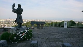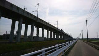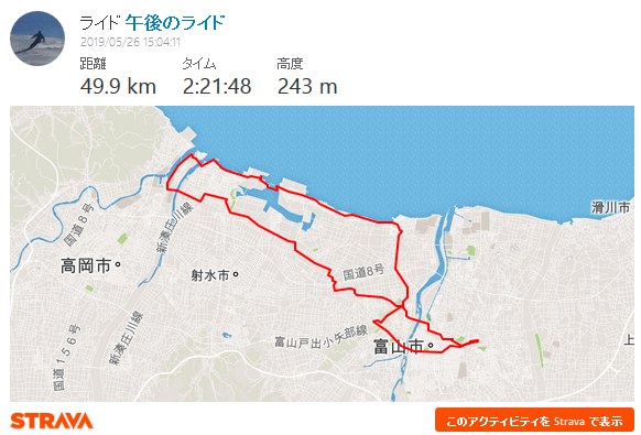 牧野大橋・中伏木・新湊・呉羽山 50km 2019年 5月26日 15時過ぎ出発、黒部名水マラソンやグランフォンド富山の参加者と出会わない西へ向かう。今日は初号機でのんびりと孤独を楽しんで走ろう。和田川方面も考えたが帰路を追い風にしたく中伏木で湾岸折り返しに決定。呉羽駅北側からR8を潜り、鍛冶川沿いを射水平野西進。片口の工場地帯を抜け、自転車で走りにくい姫野中曽根から牧野大橋へ。庄川を渡って小矢部川右岸を中伏木へ、河口で折り返し新庄川橋を渡り奈呉ノ浦、ここまで来れば後は追い風。海王丸パークでワンショット撮って、1637の渡船にドンピシャ乗船、客は自分だけだった。四方までR415、射水線跡で御廟口、短いけど今年初ヒルクライムで呉羽山、峠茶屋から旧8で戻った。大陸生まれの珍しい暖波で季節外れの猛暑が続く。遅場米の田植えもほぼ終了、麦の収穫が始まっている。休耕田の横を通ればケリに騒がれる。週末は山王祭、もう夏である。 先週は換装したアルテグラ6800の調整具合ばかり気にしてたが、今回は初号機のフレームとキシエリとの組み合わせの良さを感じた。このキシエリ、aeroadに付いてきたイクシオン付きの2013年モデル、aeroadはすぐにWH9000に替えたたため700qも走っていない新しい状態。硬めのカッチリしたホイールはカチカチのaeroadに履かせると尻は痛い手も痺れるであったが、柔めのリドレー・オリオンだとやらかい乗り味はそのまま直進性もコーナリングも安定して良くなった。6800とキシエリでバイクの性能もグレードアップした。しかし、自転車が良くなっても身体がダメ、昨年までの様に100q150q走らないと走った気がしない様な行動は無理。腰痛、膝痛、肩痛、肘通とボロボロのアラカンの身体には50q程度をゆるゆるで十分である。