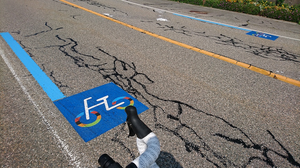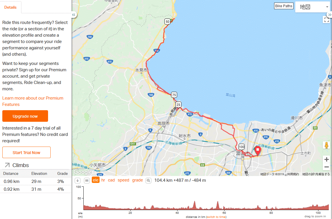 今年ようやく初の県境七尾 102km 2019年8月24日 今季ようやく初の七尾氷見県境往復。今年は西側にあまり行っていない。富山市内は地蔵盆でカラフルのぼり旗多数。。御廟口から射水線跡、R8潜って最短経路で国立高専、射水平野は黄金色、早場米てんたかくの稲刈りが始まっている。814の渡船にゆっくり間に合った。海王丸パークは明日のあいの風ジェントルライドのメイン会場らしく準備中。しかし秋にあいの風の違和感。春〜夏に吹く北東のそよ風があいの風だろうに。新湊からは向かい風だが身体が重く感じるのは今週真面目に5日連続ジョグしたから。阿尾デイリーで給水休憩。 県境まではほぼ追い風、安全のためか道路の白線が太く厚く塗り直されているが僅かな段差が少々不快。県境で写真数枚、立山連峰はまったく見えず、立山登山マラニックはどうなってるだろう。復路は路線バスと抜きつ抜かれつになり、ついつい回して比美乃江公園まで高負荷…。島尾から海岸の自転車道ゆっくり回して雨晴道の駅で補給休憩。休み過ぎてしまい、1137の渡船に間に合わせるべく全力走、何とか乗れた。堀岡からはポタリング、途中ペプシコーラ1本補給し、12時半帰宅。酷暑もようやく落ち着き、北大橋の温度計は31度、郊外は涼しく楽に走れる様になった。 ☆ ☆ ☆ 今日の立山登山マラニックは八郎坂崩壊で称名平から弘法までバス輸送となったみたい。称名〜弘法は核心部でもありこれは残念。前運営が最終回とした2014年を最後に応援に行ってないが、落ち着きそうにないランニングブーム下に、SNS上に色んな情報が大量に乱れ飛ぶことが当たり前の時代、過激なこの大会がこのまま盛大に続いていくことが良いことなのか、少し考えさせられる。それなりに走れていた頃、完走の自信は密かに持ちつつ大人の事情で出場できなかったこの大会、かなり頻回に応援に出掛けたり偶然遭遇したりしたが、記録としてまとめてたのは4つだけだった。 2014 最終回とされた年、ロードバイクで桂台まで http://gskier.ciao.jp/photo/140628/ 2011 いたち川RCの練習会、ウォークの部をアーリースタート(いたち川RC blog) http://blog.livedoor.jp/itachirc/archives/50626224.html 2010 独りでウォークの部勝手にアーリースタート http://gskier.ciao.jp/photo/100828/ 2008 自宅からジョグで岩峅寺へ http://gskier.ciao.jp/photo/080830/