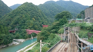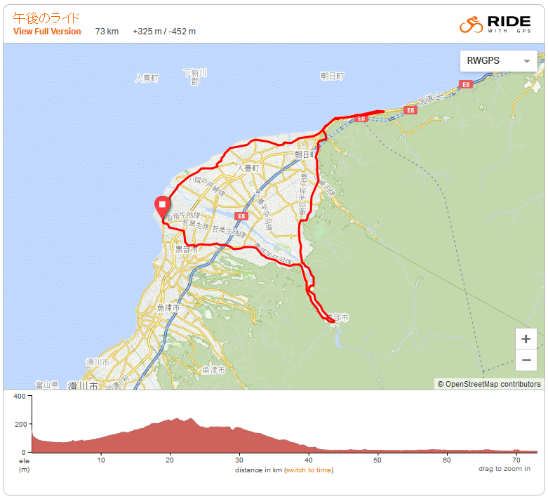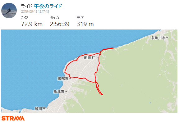 生地から宇奈月温泉・市振 73km 2019年9月15日 午前MGCをTV観戦、男子は中村・服部、女子は前田穂・鈴木が内定。12時過ぎ車にaeroad車載して出発。生地で須坂の果実屋さんから長野パープルを買うつもりだったが売り切れ残念。代わりにリンゴとマスカットを3000円ほど購入、おまけいっぱいもらった。生地漁港に車を置き、電鉄黒部駅経由でいつも走る地鉄沿いの旧道。新幹線駅近くの仁助で遅い昼食を取り宇奈月温泉へ。やまびこ展望台で写真撮って黒部川右岸から下る。愛本からのボーナスステージは残念ながら向かい風で進まない。いつも通りのルートで笹川沿い経由で市振。境川で折り返し、湾岸のサイクリングロードから宮崎…やはり境市街を通るほうがいいな。連休だからか、ひすい海岸はヒスイ探しらしき人が多かった。今日は意識して空走減らして回したら短い距離の割りに結構疲れた。 今日の富山は30度超えの残暑、しかし宇奈月温泉や朝日の山沿いはそこそこ涼しかった。セミの声は少なく弱弱しくなり、ほぼツクツクボウシとミンミンゼミ、アブラゼミを1匹だけ聴いた。宇奈月の山々は薄っすらと色が付き始めていた。平野の稲刈りは8割がた終わっており、いよいよ本格的な秋実感、昨日に続きツバメは一羽も見掛けず(気付かず)。モズの声を2か所で聞いた。帰路の運転中、常願寺川でハヤブサ。