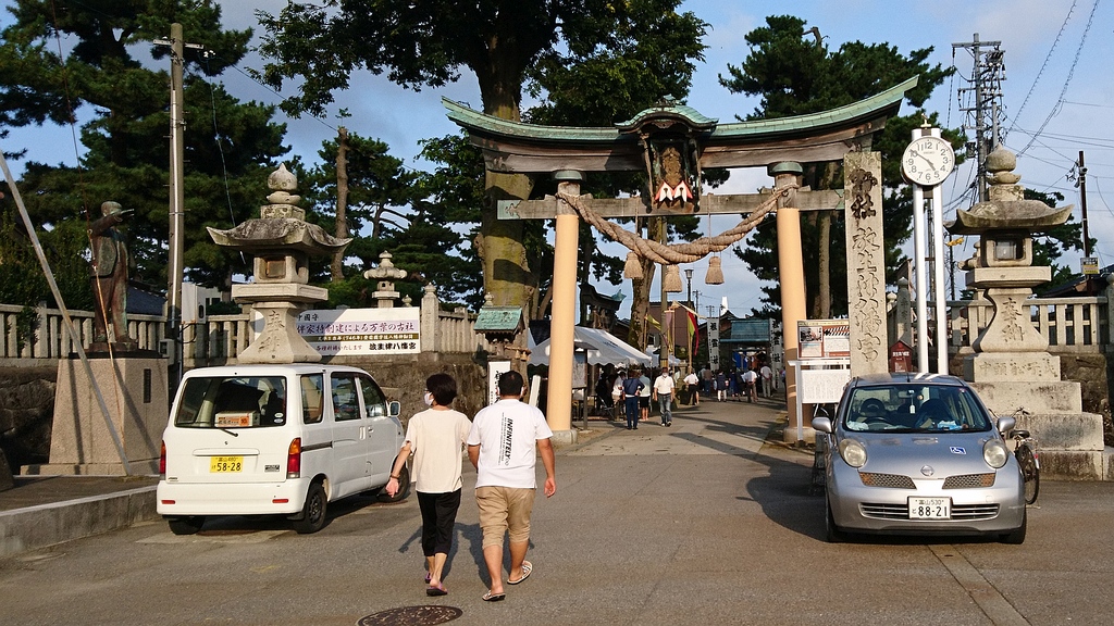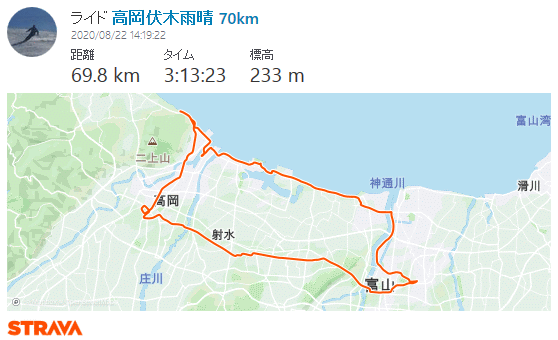 高岡伏木雨晴 70km 2020年 8月22日 酷暑続き、真昼間に出掛けるのは危険ではあるが、14時半頃にゆるゆる出発。西へ向かう定番旧8一本南側の農道は今年初。高岡駅前から山町筋と金屋町通を回る。コロナに関係なくたぶん観光客ゼロ、良い街並みだけど言わば人の居ない飛騨高山。30qくらいで腰痛、伏木国府の小さなアップダウンがきつい。雨晴道の駅で休憩予定だったが、古い街並みとは正反対に駐車場は満車で人多く密…で、雨晴駅前の自販機で給水休憩。雨晴駅で入場券を買い求める人のおかげで無人駅で無いことに初めて気付いた。帰りは湾岸、放生津八幡では神事(帰宅して調べたら祖霊社祭)、1707の渡船に乗り、神通川は定番左岸ではなく右岸から戻った。 今日は北風と言っても熱風で、向かい風と追い風のギャップ激しかった。射水平野は間もなく早稲の収穫が始まりそうな色付き、ところどころでコスモスも咲いていた。庄川はまだまだ鮎釣りの盛り。セミはアブラゼミとツクツクボウシばかり。厳しい残暑だが視覚聴覚的には完全に秋。腰痛がどうにもだめ、やはりサドル位置ハンドル高さを見直す必要あり、でも面倒だな…。 ![]()