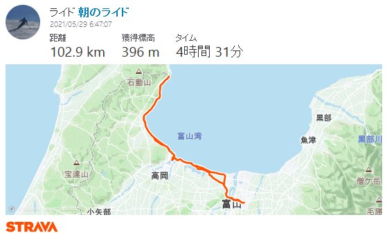 氷見七尾県境 102km 2021年 5月29日 2週空いて今年2回目のライド、昨日の予報では今日は雨で明日自転車に乗る予定だったが、tenki.jpでは降水確率20%さらに雨雲レーダーでも降ってるのは奥能登のみ、急遽準備して6時50分頃出発。初回が新潟県境にて今日はR160石川県境へ。南西の向かい風が強くとりあえず10qまではインナーのみでヤワヤワ準備運動。射水線跡道路に出ると収穫間もないだろう麦秋、しかーし南西方向に雨雲出現、自転車より上空の風のほうが圧倒的に早く、本江から降られるが我慢できる程度、水溜まりと車に気を付けて渡船乗り場へ、744の渡船がちょうどやってきた。今日はかいりゅう。海王丸パークで定点的に1枚撮り、ポチポチと落ちる雨と向かい風の中を西へ。雨晴あたりで文字通り雨が上がり、能登半島には青空。阿尾デイリーで朝食兼ねた大休憩。たっぷり休んでいざ県境へと出発した途端に大粒の雨、これはダメだで薮田のバス停に自転車ごと逃げ込む。想定外の雨宿り。通り雨だった様ですぐに晴れる。濡れた路面がイヤだったが追い風に押されて県境へ、九殿浜でホトトギスとウグイス。はしもとと夕なぎはともに暖簾掛かっていた。コロナ禍終わるまで何とか頑張って欲しい。雨雲が来そうで県境で写真撮ってすぐ折り返す。 帰りは当たり前だが強烈な向かい風で進まない。比美乃江公園で便意に襲われトイレへ。大問題解決後は身体も軽くなり追い風にも助けられるが、徐々に腰痛が始まり公道を避け島尾からサイクリングロード。雨晴で持参おにぎり休憩。国分のところてんの奥さんは今年も営業されてた頑張れ大正生まれ。如意の渡し大橋は向かい風きっつい。1137の渡船には余裕で間に合う、朝はかいりゅうだったのに何故かこしのかたに。2階に上がるとウーム座席が全部無くなってた。海老江は今週のこころ旅3日目の目的地、昼飯は江戸一で食べてたな。四方からの射水線跡は最後の試練の向かい風、腰痛我慢我慢で何とか富山に帰着。雨の中走ったので自転車の汚れ酷く特にホイールが砂だらけ、2週連続初号機、そろそろ弐号機も準備せねば。 ![]() ![]() |