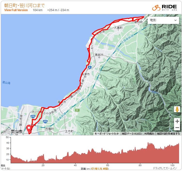 朝日町・笹川河口まで 104km 2022年 6月19日 1週空いて今年3回目のロードバイク、11時ちょい前に出発、1800m農道経由の浜黒崎から湾岸、向かい風の中、普通に滑川・魚津・黒部と進み市振を目指す。経田手前で腰が痛くなって我慢我慢で魚の駅生地で休憩、持参おにぎりで補給。須坂の果実屋さんと地元の取り巻き旦那衆は弁当で昼食べてた。K2目川交差点から吉原、そのまま海岸沿いを小川河口へ、赤川橋を渡る頃には腰が限界もうへろへろ、泊駅前のドラッグストアでゼリーパウチ2個、プロテインスティック、バナナ3本の計498円購入、笹川河口でこれらを補給。市振は断念して引き返す。復路は追い風で助かるが何せ腰が痛い。おまけに新しいサドルの位置も微妙。魚の駅で3度目の休憩、果実屋さんから巨大柑橘頂き1時間ほどの大休憩。滑川までそれなりに回して、あとはポタリング…疲れたが3回目で100kmなら上々、課題は腰とサドル。 梅雨の晴れ間、麦はすべて刈り取られ、水田は水面が見えなくなり2週間の時の流れまざまざ。暖気が入り最高気温31度とのことだったが、海沿いは意外と涼しかった。しかし陽射しはきつく剥き出しにしてた腕の皮が日焼けで剥けた。ロードバイク乗るのに土日に縛られる週末は来週あと1回のみ。土日どちらかでいいから晴れてくれたら。 |