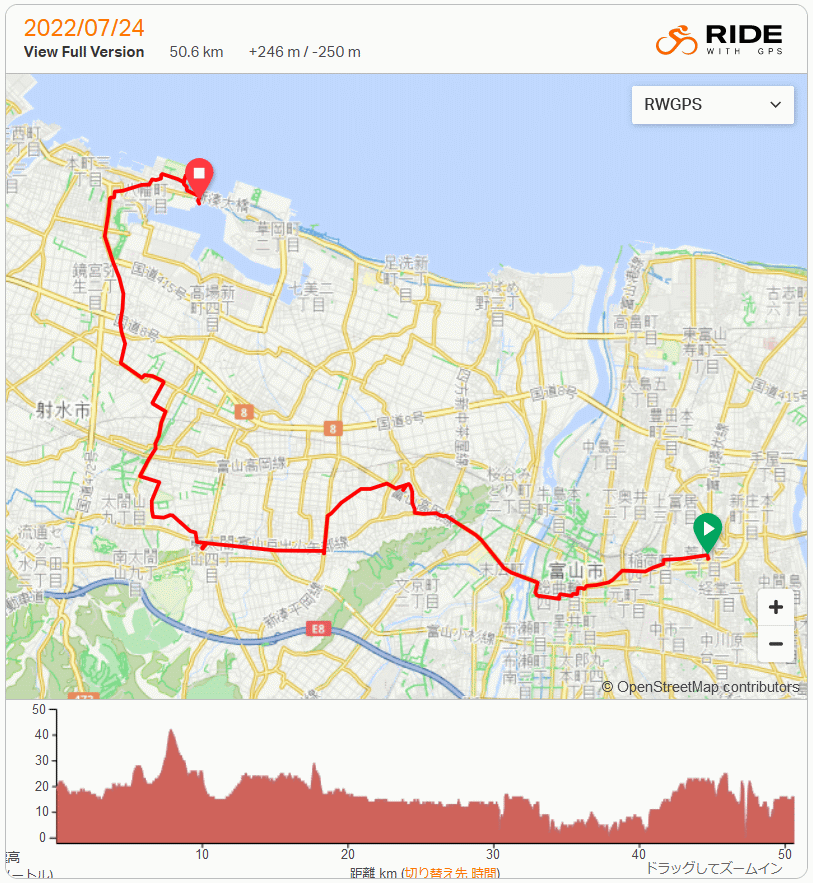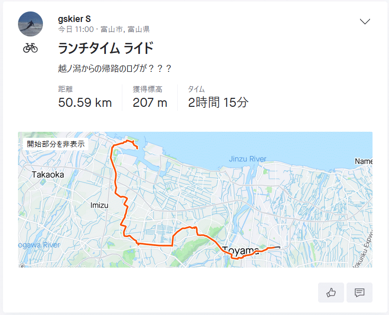 呉羽〜小杉〜海王丸パーク 50km 2022年 7月24日 サンデー毎日なのにまた平日でなく週末ライド…、妻子が出掛けてる間の約2時間半を無計画に西へ。当初海沿いを考えたが渡船時刻に合わず、呉羽から南下中に中央サイクリングロード(以下CR)を横切り…約40年前30年前20年前にそれぞれママチャリで走った記憶が蘇りついつい進入。幻の加越能鉄道・高速鉄道計画が頓挫してできたCRであるが、横切る道路が優先でやはり「止まれ」だらけ、太閤山近く黒河地内で辿れなくなり、以降は適当に射水平野を進んで海王丸パークへ。1237の渡船に乗りほぼいつも通りのルートで帰宅。GPSログが何故か越ノ潟以降取れてなかったが距離は正確…変なの。 学校の夏休みが始まって最初の日曜、公園や海岸は人出が多かった。海老江海浜公園は満車で路上駐車、県外ナンバーも目立った。先月まで平日は毎日の様に散歩してた環水公園も大賑わい、ゴールドウィンが期間限定の遊具スペースを設けて子どもたちが密密密に遊んでいた。コロナ第7波のピークはそろそろと思ったけど、この人出見てるとどうかなぁ…である。 |