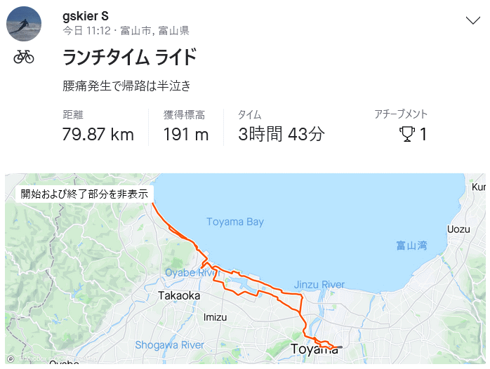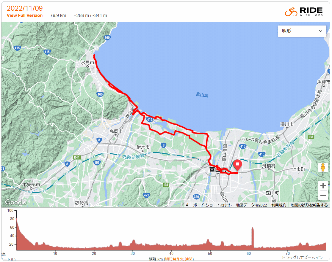 比美乃江公園 80km 2022年11月 9日 2日前の立冬に続き小春日和、ロードバイクで出掛けねば勿体無いくらいの好天で11時過ぎに出発。海越しの立山連峰を観たく氷見七尾の県境を目指したが身体が重い…6日の古城マラソン10kmの疲労が回復してない様で腰痛も発生、比美乃江公園で大休憩してそのまま折り返し帰宅した。60才の肉体であること、腰痛が持病となっていること…言葉で理解してるつもりも身体も頭もそれを認識し切れていない様である…反省。さらにeTapのFD側バッテリーが残容量ゼロとなっていることを途中で気付いたが、動かない身体ではインナーさえあれば十分だったとは言え、出発前の点検怠ったことをこれまた反省。 今日はジョウビタキの声をよく聞いただけでなく姿を3回も見られた。新港貯木場はカモが多数、環水公園では見られないオナガやハシビロも居た。ススキの穂はほぼ枯れ、セイタカアワダチソウが絶頂の盛り、あと何回ロードバイクに乗れるかと考える季節になった。冬用ジャージが不要なのは今日が最後かもしれない。 |
