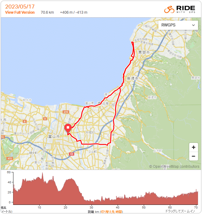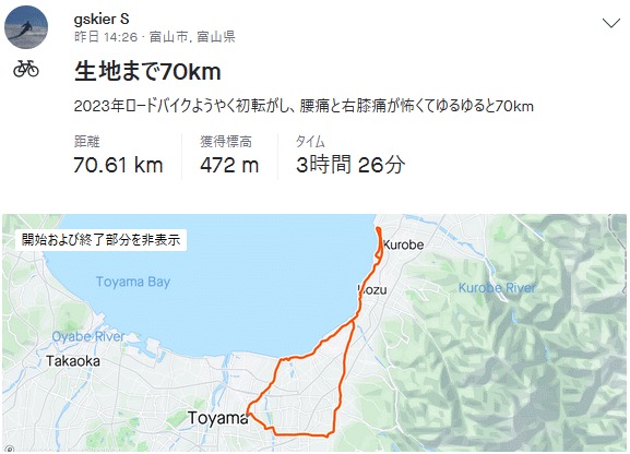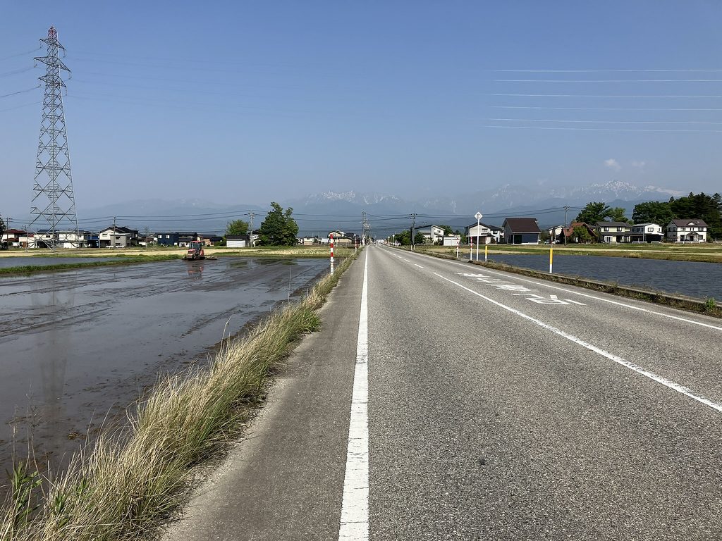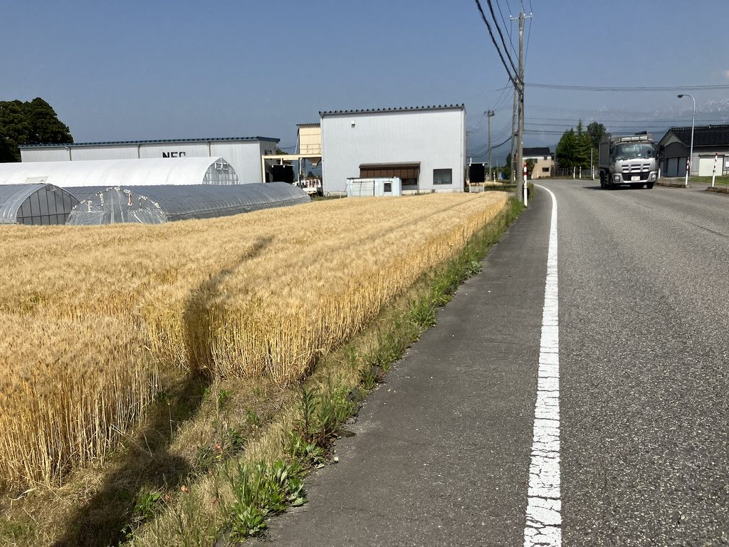 生地まで 70km 2023年5月17日 2023年のロードバイク転がし始め。3月に右脹脛肉離れ、4月半ばから右膝に痛み、運動は散歩しかしてないのに老化による加齢劣化に苦しみ、ロードバイクの乗り始めも遅れた。おかげでいきなり半袖ジャージで済んだ。14時半過ぎに出発、帰路に追い風となる様に考えると西に向かうべきであるが、やはり乗り始めは11年前の最初のライドであった生地を目指し、あの時の新鮮な心を思い出したい。往路は富立大橋から上市滑川魚津の定番ルート。スーパー農道で速い2人組にシャーッと抜かれたが、この足腰ではとても追いかけられない。湾岸は軽い追い風、最高気温30度の予報だったが郡部はそこまで上がらず気持ち良し。魚の駅生地は定休日、高橋川河口の小さな園地で大休憩。帰りは向かい風、海の駅魚津&道の駅滑川でプチ休憩しつつゆっくり戻った。 麦秋を迎え、田植えの終わった田んぼがほとんどだったが、中には未だ綺麗な水面のままの田もあり、今の時季ならではのリフレクションが美しい。最初の子育てが始まったツバメ達が飛びまくり、新葉が伸びてきた葦原ではオオヨシキリの大合唱、ここらから梅雨明けまでが最も素敵な季節、速度出せなくても自転車楽しみたい。 |
