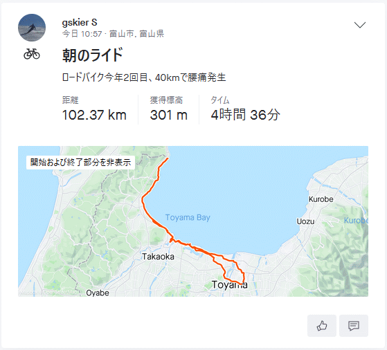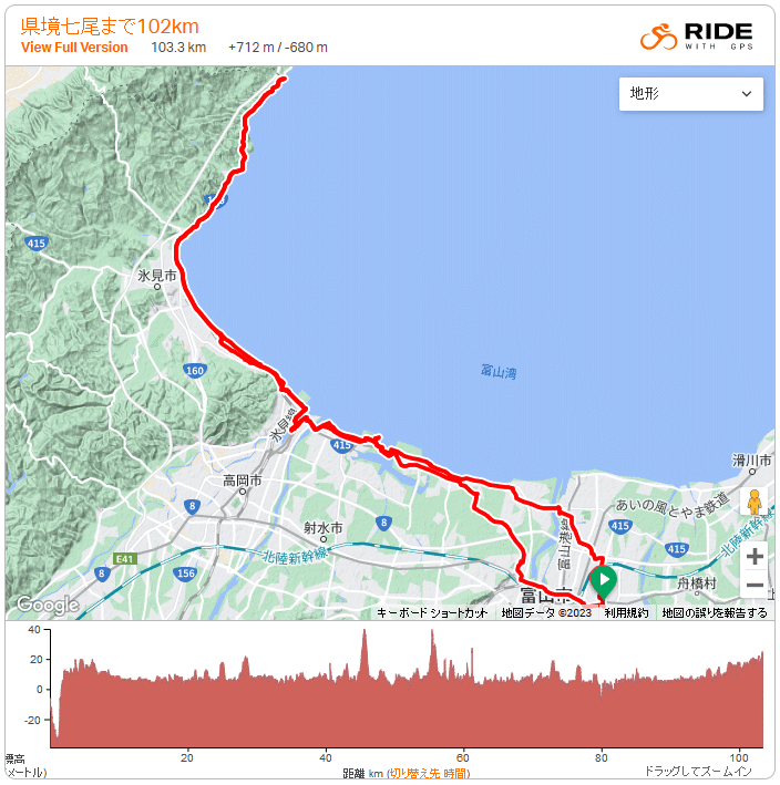 県境七尾まで 102km 2023年 5月27日 来週は梅雨の気圧配置となり平日は雨予報にて無職だけど週末のライド。11時頃出発、今日は西へ。射水線跡から新湊への最短路を行くつもりが左折が手前だった様で少し遠回り、1144の渡船に間に合わせるべくプチスパート。今年初渡船は「かいりゅう」、2階席はおでかけの親子連れで賑わってた。いつもの経路で雨晴、大抵は復路に通る海岸沿いの管理道路へ、島尾手前で大休憩。ここまでは体調良かったが、北に向かうにつれ徐々に向かい風強くなり、氷見漁港過ぎに腰痛発生。我慢我慢で走り、県境で大休憩。30cmクラスの巨大なアメフラシ発見。帰路は追い風も腰に加えて右膝の違和感でやわやわ、阿尾デイリーで早くも休憩、その後もペース上げられず1507の渡船を諦め、海王丸パークで大休憩、1537の渡船乗船、荻浦橋から蓮町公園に抜け、豊田の極低ガードで線路潜り千成地内から帰宅。 出発時の富山市内は気温高く半袖でも暑かったが、射水平野から先は涼しく快適で早くも梅雨の晴れ間の気分。湾岸はロードバイク多く何度も挨拶交わした。雨晴では集団のランナー、どこかのクラブかな。九殿浜で今年初ギンヤンマ、ホトトギスも初聴き。県境近くの薮下酒店に3月廃業の張り紙、手前の津田酒店も営業の雰囲気感じられず、コロナ禍で客激減の民宿に酒類売れなかったのが致命的だったのか。はしもとやの暖簾が出てないのも気掛かり。 |