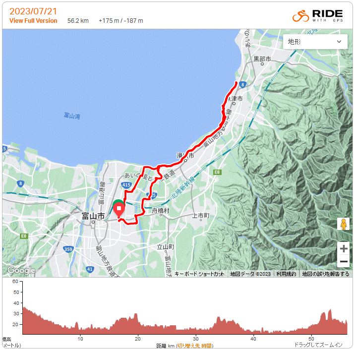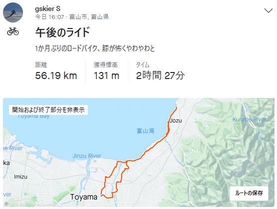 経田漁港まで 56km 2023年 7月21日 右膝養生で1か月ぶりのロードバイク。16時過ぎスタート、往路はきつい向かい風、超お久しぶりの1800m農道から浜黒崎、湾岸を我慢我慢で経田漁港まで粘る。給水休憩して折り返す。復路は追い風も右膝の違和感が怖くてやわやわ回す。早月川渡ってからジワジワと心拍160まで回してみる。40km/h前後でロードバイクの快感…これだよなぁ。水橋常願寺経由で常盤橋渡り、自動車の帰宅渋滞を避けて藤ノ木まで迂回して帰宅。結構疲れてバイク掃除にしゃがむ動作がキビシかった。 梅雨前線が明瞭にあるのに微妙な梅雨明け…気象庁は前線消滅型を想定してるのか。移動性高気圧のおかげで最高気温も30℃。連日32〜37℃と厳しい暑さが続いたので30℃でも涼しく感じた。1年前から車中泊使っての県外遠征を妄想してるけどなかなか実行できず。どうしましょうかね。 |