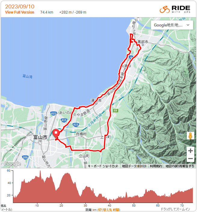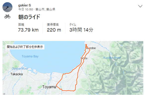 生地まで 75km 2023年 9月10日 10時45分頃出発、初心に戻って11年前ロードバイク乗り始めたばかりの頃よく目的地にした生地へ。富立大橋からいつものルートで立山町上市町滑川市、ずっと強い向かい風で25km/h程度の速度でも心拍上がる。魚津から湾岸に出ず風から多少は逃げられる魚津高前の道、田家のあいの風TRの踏切は工事が終わり通行できた。バイパス潜って運動公園へ、道の駅は大賑わいの模様。魚の駅生地でおにぎりの昼食のつもりが12時台で早や売切れ、須坂の果実屋さんも不在、ファミマでおにぎりとジュース買って石田浜近くの東屋で補給休憩。帰路は湾岸、追い風でついつい回したくなり結構な疲労。常願寺左岸から帰宅。 右脹脛の軽い肉離れまたやってしまい、10月になるまでジョグは我慢。暫くロードバイクで負荷掛けたいのでそろそろこの馬鹿暑い気温は何とか落ち着いて欲しい。郡部は富山市よりは涼しいのか稲刈りが遅めであったが…今日はギラギラの夏の空だった。とは言え、セミはツクツクボウシしか鳴いて無いし、モズは高鳴きしまくり、秋はちゃんと進んでいる。でも秋らしい気候はとても短い予感。 >>Polar Flow Traning Analysis. |