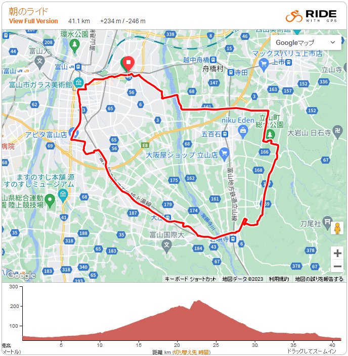 太田口通り〜旧飛騨街道?〜上滝〜瀬戸 41q + 柴垣海岸散策 2023年 9月18日 2時過ぎに台所でヤカンの取っ手が倒れる音で目覚めそのまま起床。4時からNHK-BSでラグビーW杯・日本イングランド戦視聴、前半善戦も後半は圧倒された。負けると続く番組視たくなく、せっかく早起き(早過ぎるが…)できたしで6時半前にロードバイクで出発、一昨日の散歩でこの通りもしかして旧飛騨街道と疑った(たぶんに間違い)道路とその下を流れる用水の分水点を確めたに太田口通りへ。歩道とゆっくり疑惑の道の始まりとなる白山社へ向かってると…向かい側に立派な白山神社が思わず「こりゃどいうこっちゃ」…これは帰宅後の調査で立派な社は今の神社で、自分が気にしてたのは古宮と判明。で、古宮の左側の参道から続く道路を眺めると富山高校まで本当にきれいな一直線、そして道の下は暗渠の用水が続く。富山高校前で県道317に合流、県道317で用水は歩道下の暗渠となる。この用水を追い掛け行くと自分の想定通り、中田書店近くで草島線渡った場所に水門があった。本流はやはり広田用水補給水路であった。しかし富山の街中へと続くこの分水された用水、富山高校付近までは水田もあるがそれ以北はまったく無用の用水か…。ともあれ、この道が旧飛騨街道かは不明であるが飛騨へ向かう道として使えたことが間違いなく、とてもスッキリした。雨の予報もあったので走行距離が40km程度になるべく脳内でルート作成、県道43で岩峅寺へと向かうことにした。途中K188から太田川(太田用水)沿いを通って堀から県道43へ。あとは上滝線とともに只管南下、交通量多い道路で日中はなかなか走る気になれないが、連休の早朝で車は少なく路肩も広いので安心して走れた。立山橋で立山町へ、県道6をそのまま下って戻るつもりだったが、眺望の良い瀬戸に行きたくなり吉峰に上がって県道157へ。富山平野と富山湾を遠望しながら一気下り気持ち良し。K157がスーパー農道と合流後、日中で左折、立山町総合公園から段丘を下り、最近使ってる一般農道金剛寺へ続く道を北上、フジムラ富山工場で左折し、東への出発定番道路を逆走…何故か新鮮。この後、常願寺川を北上して距離を稼ぐことも考えたが西の空には明らかな雨雲…富立大橋を渡って最短距離で帰宅した。帰宅後、間一髪ではないものの30分ほどで雨が降り出しラッキーだった。 毎日まだ真夏の様な酷暑が続くが、逆に稔りの秋は早く富山市内の田んぼはほぼ稲刈り完了、立山町でも半分以上稲刈り済んでいた。セミはツクツクボウシが過半、弱弱しいミンミンゼミは偶に聴いたが、アブラゼミやニイニイゼミは皆無。モズはギチギチと至るところで高鳴き聴けた。ツバメは田園地帯ではまだ飛んでいるが街中ではほぼ見かけなくなった。10月も暑いらしいが、カモ類の渡りは遅いのか、サケもちゃんと帰ってくるのか…。 このあと昼から行った柴垣海岸での散策と能登のドライブはこちら。 >>Polar Flow Traning Analysis. |