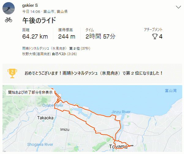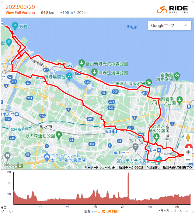 新鍛冶川〜牧野大橋〜雨晴、帰路は湾岸+神通川左岸 65km 2023年 9月29日 もう少し早く出発したかったが一晩で突如仕様が変わったiphoneカメラアプリに納得いかずgdgdしてて14時過ぎに出発、今日は西へ、氷見港あたりまで行きたかったが、17時半には暗くなるので雨晴までとした。往復同じ道を走るのは避けたく、行きは呉羽から新鍛冶川沿いを新湊まで、R415で姫野、ZAICAやムサシの通り一本南側の住宅地の道を西進、中曽根神社に出る道のほうが良かったか。牧野大橋で能町口、伏木港大橋で伏木市街、旧道とK245で国分、道の駅雨晴でトイレ&給水休憩。平日だったが観光客まずまず。復路は湾岸、渡船の時刻に噛み合わず、海王丸パークで1枚撮ってから新湊大橋を徒歩。四方漁港〜八重津浜、今日は四方市街の裏道走って荻浦橋に出た。神通川左岸でようやく追い風、スタミナほぼ切れ掛けてたので有り難し。神通大橋で右岸へ、富山大橋東詰から城址公園経由、既に帰宅渋滞始まっておりイヤだけど旧8の歩道を徐行して帰宅。 凄まじく暑い夏もであったが、これほどの酷い残暑が続く秋も初めて。今日は北風が強かったが気温はさほど低くはならず富山市内は真夏の様に30度であった(その30度が涼しく感じる異常さ)。とは言え視界に入る自然はほぼ暦通り、紅葉はうっすら始まり、モズの高鳴き多数、セミの声はついに聴こえず、ツバメも一羽も見掛けず。日暮れが早いことを除けば自転車には良い季節である。今日の収穫は姫野〜牧野大橋と四方市街のルート、自動車の多い大通りを避けられる道は貴重。 >>Polar Flow Traning Analysis. |