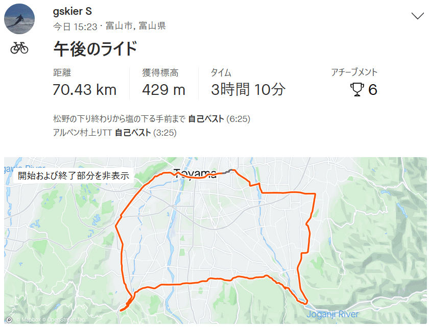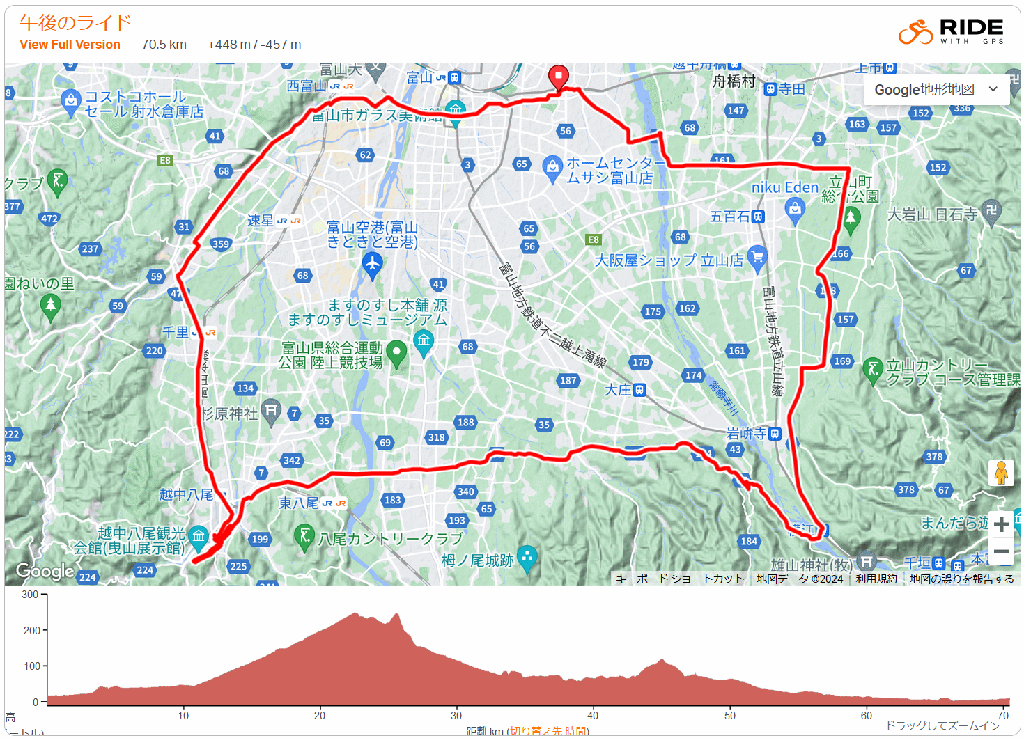 農道金剛寺〜横江頭首工〜八尾 70km 2024年 6月26日 土曜の富山湾岸UMの疲労がまだ抜けていないが貴重な梅雨の晴れ間、短時間でも走りたく、多少は涼しくなった15時半頃に出発。山沿いで好きな農道金剛寺線と熊野川沿いの県道183(イヤサー)を横江頭首工からの山越えで繋ぎ、大山町〜大沢野町から趣ある八尾旧町まで走り、高山本線沿いを一気に下って富山に戻った。今年に入って海沿いばかり4連続であったが、山沿いも美しく、改めてロードバイクが楽しい富山の良さを認識。腰痛が和らいだら登坂能力を少しでも取り戻して山中にも入ってみたい。6月も終盤、立山町でニイニイゼミの初聴き。6月に苗を植えたとしか思えない田んぼがそこそこあり、品種は何だろう…てんこもり?だろうか? 常願寺川左岸からクマの人身被害があったばかりの文珠寺に下る際は獣の気配と言うか音と鳴き声あったが多分イノシシかな。八尾では山の上に夕立降ってるだろう入道雲、良い季節だ。 |