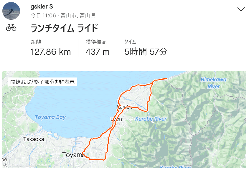 愛本・市振 128km 2024年 7月18日 6月以降、週1回はロードバイクに乗りたいとローラーも使ってるがやはり外を走りたい、今日も酷暑予報だが水被りながら漕げば何とかなるだろうで11時過ぎに出発、昨日の12kmジョグの疲労か脚が回らない。常願寺川を越えると気温は体感2度は涼しい。結構キツイ向かい風の中、ほぼいつも通りのルートで立山上市滑川、上市市街で成田ナンバーのgoogle撮影車両と遭遇、停止したらドライバーが御辞儀、ストリートビューに反映されるのはいつ頃かな(9月に映り込んでたのを確認)。大光寺交差点から魚津市街、上村木で七夕の予告…とても綺麗だった7年前の夏祭り&サンセットライドを思い出す。魚津持光寺の711で最初の休憩、バナナ1本とジェルパウチ。桜井から宇奈月への旧道、箱根清水で給水。愛本から舟見〜朝日のボーナスステージ、向かい風+疲労で速度上がらず。腰痛も出て何とか道の駅市振、補給の定番ラーメン+冷や奴と注文すれど豆腐売り切れで代わりの小ライスが重かった。 復路は追い風、しかし全身に乳酸感じて脚が回らない、真正面からの日差しがキツイ。高瀬湧水で給水さらに全身に水掛けまくる。下黒部橋は工事で交互通行、イヤだけど歩道を走る。魚の駅はパスして道の駅をクーリングシェルターとして使おうも今一つ休憩に不向きな感じ…でも20分ほど休んで少し復活。魚津港にちょっと寄り、滑川漁港で最後の給水休憩、常願寺左岸から帰宅。7月半ばだが早稲の穂がもう出て香りも感じた。百日紅は気温高い場所ではもう見頃、朝日町ではこれからか。アガパンサスが至る所で満開、この花が終わると最も好きな季節の終わり。上市・上村木・経田の七夕祭りは8月7日、魚津のたてもんや花火大会は土日とずれるので7年前の様にすべて同日ではない。朝日町ひすい海岸の昭和女子大海の家はコロナ禍以降開催無いが今年も情報無し。常願寺左岸のオオヨシキリはまだ頑張って鳴いていた。能登の震災被害、魚津港の修復工事はほぼ完了も養生で駐車場は過半が使用不可、通り抜けもできず、富山でもまだまだ掛かるが、何とか被災者には希望の持てる優しい夏になって欲しい。 |