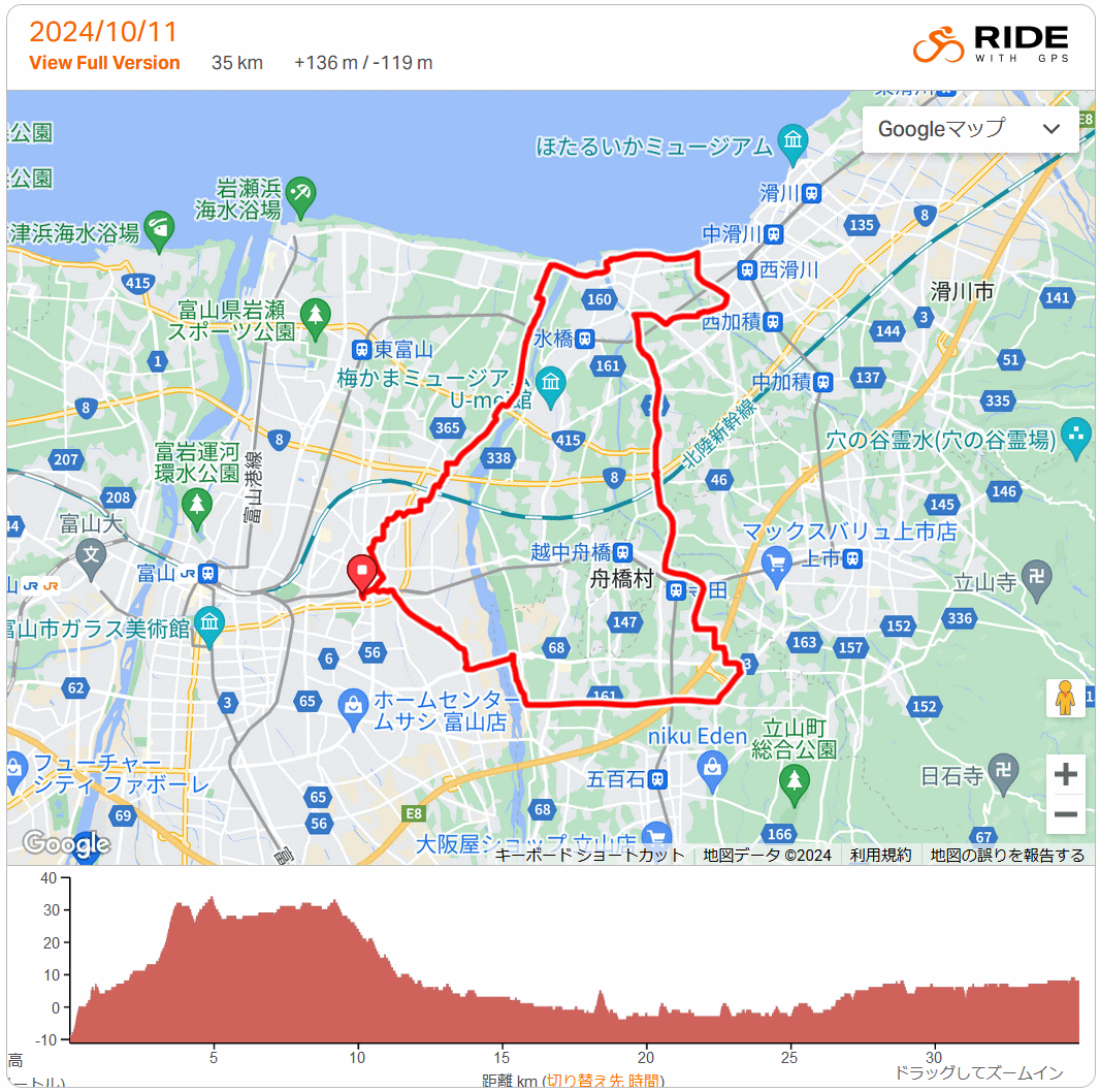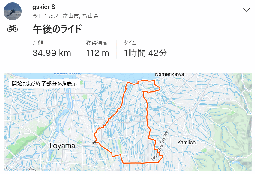新ヘルメット+新シューズの試運転が、まさかの雨 35km 2024年10月11日 天気や体調を言い訳に4週間も乗ってないロードバイク、 新調したヘルメットとビンディングシューズ(崩壊したのでストックしておいた2世代前の新品シューズを出した)の身に着けて違和感無いか、2時間程走るつもりで16時出発、当初は定番ルートで上市まで行き、滑川の海岸に抜けて湾岸から戻るつもりだったが、田添駅を過ぎると雨が降ってたらしく路面が濡れ所々に水溜まり、青空だしそのうち道路も乾くかとそのまま進めば、ささら屋前の沢端交差点で雨が降り出した。BORAを雨天下で使うのはイヤで雨雲を避け、農道をジグザグに北西へと逃げる。寺田駅近くでようやく雨雲から脱出。車が多かったがK15をそのまま北上し水橋へ。10月も中旬が近く、もしやサケが帰ってるかと上市川を見に行くも上流の雨のせいか濁ってて分からず。高月に出てK1と常願寺左岸で戻った。ヘルメットSH+のshabliはなかなか良い、フィット感も軽さもselev mp3を上回る。シューズ・シマノRC701は内反小趾の特に右小指の先が痛む、これはさらなる加工必要か様子見。田んぼの稲刈りはほぼ終わり、セイタカアワダチソウが色付き、至る所でキンモクセイの香り、セミは一度も鳴かず、ツバメも一羽も見ず、常願寺川あいの風TR鉄橋の上流側に白くて大きな鳥、遠くてコハクチョウかダイサギか分からず。残暑がストンと終わっていきなり晩秋手前の雰囲気である。 |