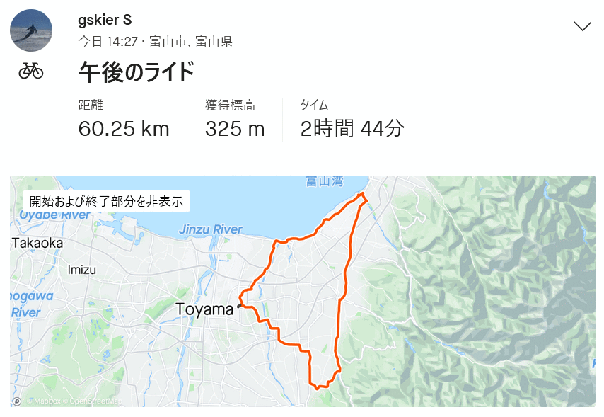 白岩川ダム〜魚津水族館 60km 2024年10月17日 家族の風邪が感染し咽喉の痛みあり、4日前の上市フォトロゲの疲労感も少しあり…であったが、短距離でも週1回はロードバイクに乗りたい〜で、14時30分頃出発。信号のタイミングやコロコロ変わる自分の気分もあって、何となく荏原駅前から富立大橋…やはりいつもの道が安全か。利田小の通学路の農道を初めて通り五百石往来、役場前の書店付きローソン初めて見た。中央商店街からK6、子どもの宿舎&職場前を通って米道、瀬戸に上がって白岩川に下って上って、三年ぶりに白岩川ダム。白岩川左岸から一気に上市、定番のK3で旧R8まで、早月大橋から魚津水族館に下りて大休憩。帰路は追い風に乗って湾岸から戻った。常願寺左岸で日没、ライト点灯してスーパームーンを何度か振り返りながら帰宅。今日は気温27度の夏日で半袖1枚でちょうどだった。とは言え、至る所でキンモクセイが香り、モズが高鳴き、匂いや音は秋中盤、次回は重ね着や長袖さらにはロングタイツが必要かもしれない。今日の反省、魚津からeTapのRD側バッテリーが上がってしまい、バッテリーを前後交換しながら滑川港までアウター、家までインナーと何度か停止。充電してなかった自分が悪いのだが、まぁ短い距離で良かった。2日目のヘルメットとシューズ、shabliのインナーはバンダナよりcapがいいかなRC701は内反小趾少し馴染んできた。 |