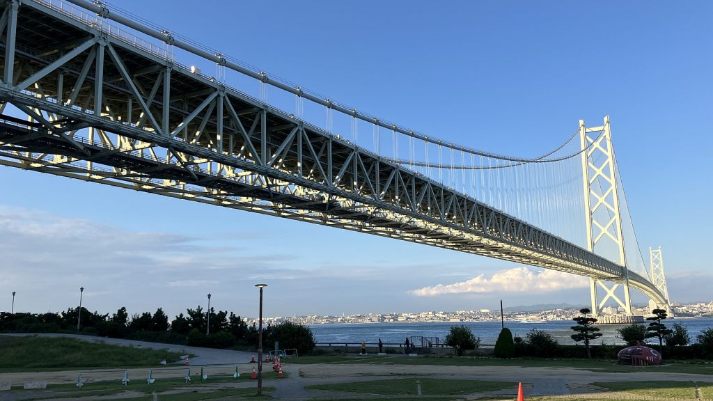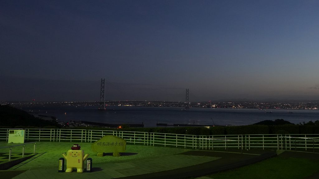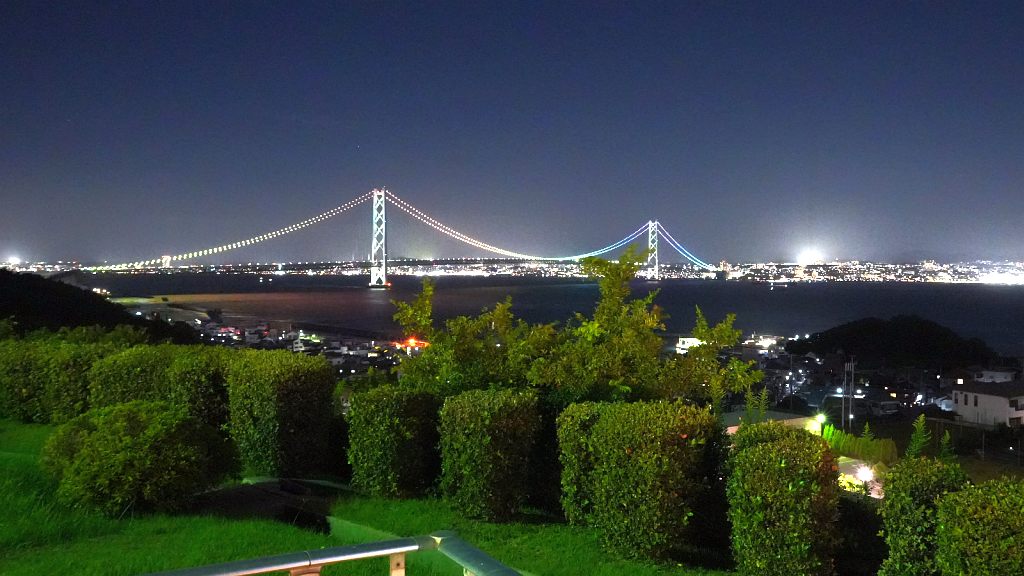 10月6日13時45分に自宅を出発、流杉PAで北陸道、南条SAでトイレ休憩ついでに隣接の道の駅見物、敦賀JCTから舞鶴若狭道へ。NEXCOのナビでは米原からの名神経由が早いと出るが京都〜大阪〜神戸を渋滞無しで通れるはずが無し。美浜⇔三方が通行止めでR27迂回し三方ICから再び高速、小浜で積極的休憩兼ねて高速を下りガソリン給油、小浜西ICから三度高速へ。吉川JCTから中国道、神戸JCTから山陽道を乗り継ぎ淡河PAで大休憩、ビワイチ前日同様に何故かまた焼きそば定食で夕食、食後にトラックドライバーに混じって300円のコインシャワーで風呂代わり。三木JCTから神戸淡路鳴門道、淡路SAに20時半過ぎ着。駐車場はほぼ平で車中泊には適。NHK72時間で放送されたサービスエリア…と言っても自分は下り側のみだがちょっと散策。駐車場隣接の観覧車は21時の営業終了同時にライトダウン、海側にライトアップされた明石海峡大橋、明石〜神戸の綺麗な夜景、はるか大阪市街の灯りを楽しむ。十五夜の月は既に天高くもう少し早くに着いてれば…と少し残念だったが、アオマツムシではない日本のマツムシが鳴いており気持ち良し。オートバイの騒音が少し気になったが、22時就寝。