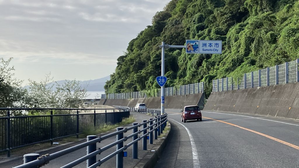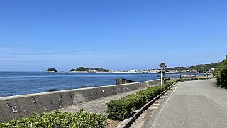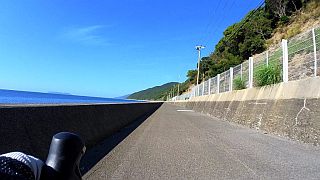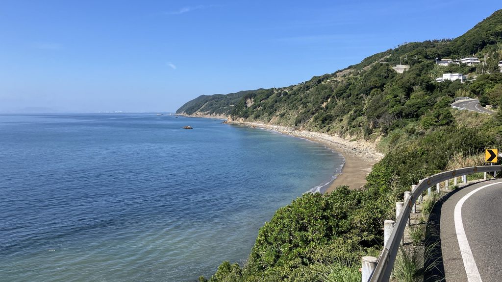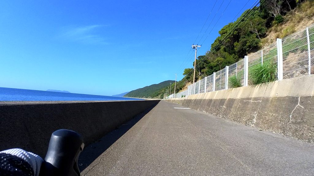 R28は淡路市の市街地を抜けても洲本市街までは両車線とも車が多い。洲本に入ってすぐAWAJIの文字オブジェ、記念撮影にもってこいに見えるが敷地に入るには地主?の芋屋で買い物しないとNGでクチコミの評判実にヨロシクナイw 淡路市からは遠くそれらしいと見えた友ヶ島と地ノ島そして紀淡海峡がはっきり分かる様になる。洲本市街はR28とお別れしK76を進む。琵琶湖や富山湾岸の様に青線が全てのルートにあるわけではないが、要所要所にルートを示す看板があるので迷うことはあまりなさそう。洲本港を過ぎると交通量は一気に少なくなる。洲本温泉から南は道路沿いの建物も減り鄙びてくる。超高級赤ウニの産地である由良は天然の防波堤成ヶ島に囲まれ何とも独特の雰囲気(衛星写真で見ると北側の山は関空埋め立てのために掘削されてかなり無残だが…)。コンビニの無い由良で唯一の補給店・ライフ由良南店で2回目の休憩、ミネラルウォーター買ってペットボトル交換、特にバテ感無くカロリー接種せずアミノバイタル補給のみ。