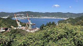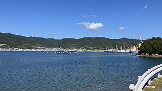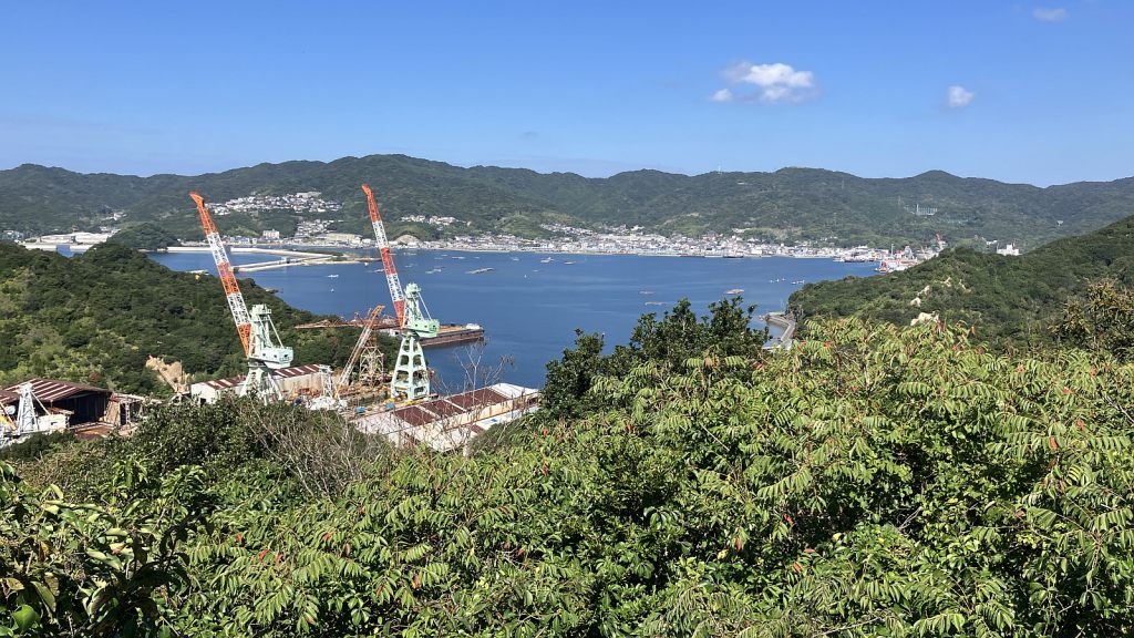 上り切って福良港を見下ろす 巨大クレーンは栗之浦ドック淡路工場