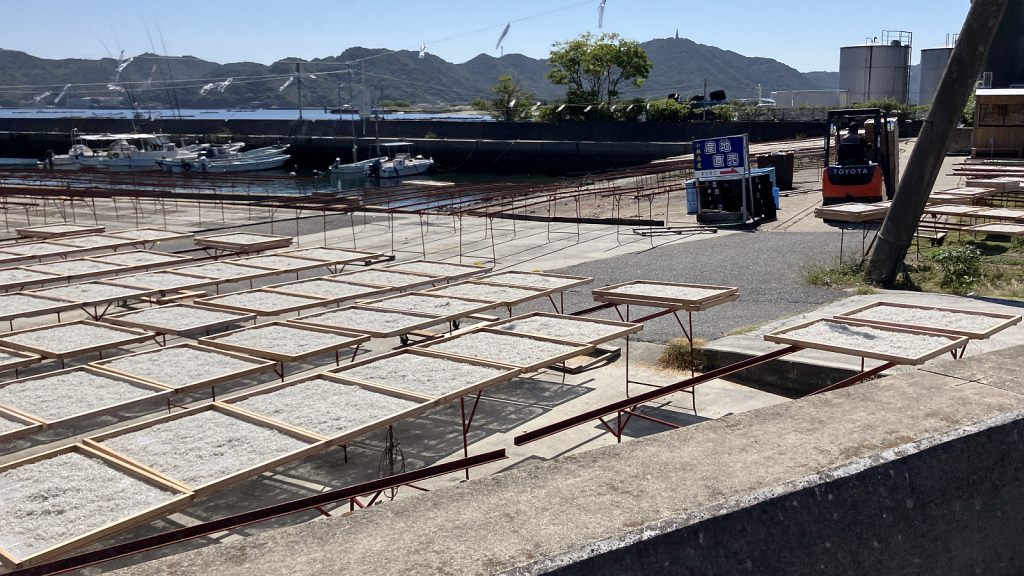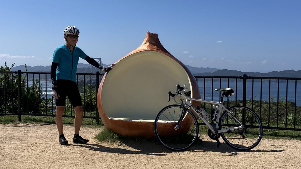 福良港右岸側はちりめんロードの愛称付いてるだけあって、漁港直結の加工場がずらりとならび大量のしらすが干されていた。しらす丼でも良かったな。鳴門岬へと続く本日4個目の坂はアップダウンが繰り返し。しかし今回最も楽しみにしてた鳴門岬訪問はNG、道の駅のリニューアル工事で通行止め、警備員に追い返され残念無念。仕方なくうずまちテラス(何故か休業中)に行き、遥か遠くにうず潮らしき海面を眺めつつ、玉ねぎのオブジェ付近で記念写真。またupdownを繰り返し、阿那賀漁港から温泉うめ丸の短い坂をこなすといよいよ淡路島西岸、穏やかな瀬戸内海は播磨灘が広がる。海の向こうの山は小豆島か。5回目の休憩は約95km地点にある花トイレ、飲料自販機もありペットボトル交換&アミノバイタル補給。鳴門岬ですれ違ったTREKの方がやってきたので一寸だけ会話。