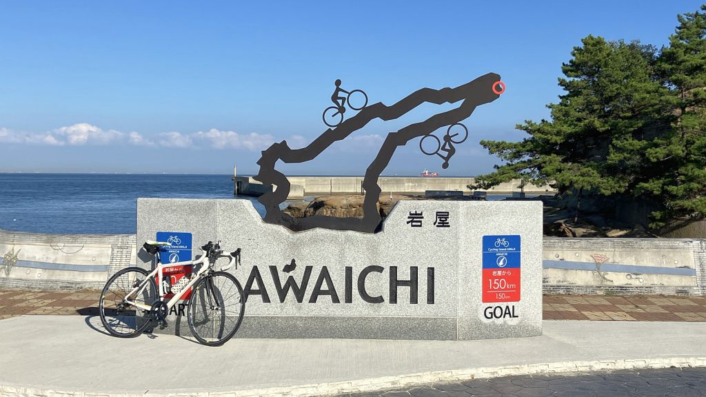 海の向こうの明石〜加古川の阪神工業地帯が見えてきて明石海峡が近い実感。東進するコンテナ船が速い。ロードサイドにはさらにお店が増えてくる。阪神淡路大震災の野島断層保存館は寄りたかったが、まーいつかまた来れたら(可能性極めて低いが)。ハローキティの巨大ショップを過ぎると明石の街並みがはっきり分かる様に。残り4kmを過ぎると明石海峡大橋が見えてきて、ようやく旅が終わる安堵感。岩屋港のアワイチオブジェに着くと団体のサイクリストが記念写真撮影中、皆さんアワイチ終えたとは思えないほど元気過ぎる…ショートコースなのかな。団体さんが去るのを待って自分も写真2枚。岩屋漁港の駐車場到着15時30分、予定より30分遅く出たけど30分早く到着。