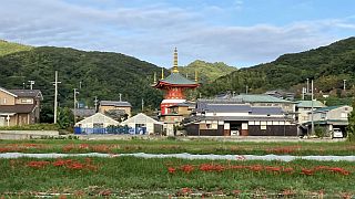 朱色の塔が目立つ八浄寺 島内七福神巡りで大黒様が此処だそう