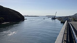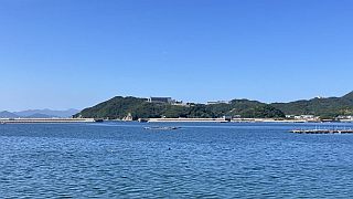 由良大橋から由良漁港を見下ろす 成ヶ島は天然の防波堤か