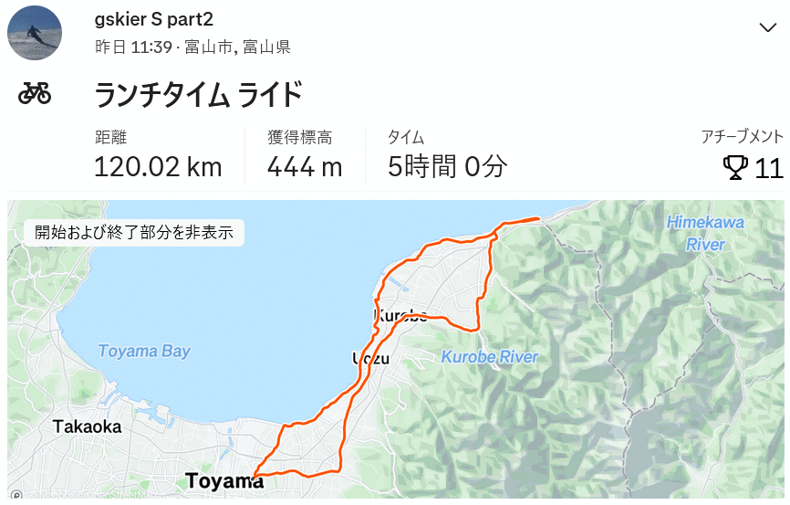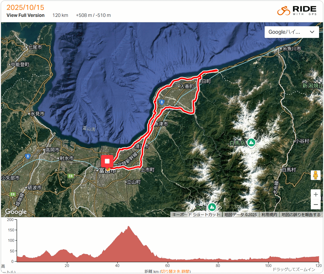 上市往来から愛本・市振 120km 2025年10月15日 琵琶湖、淡路島と車中泊遠征が続いたが今年はまだ県境(新潟・石川両方)を越えておらず、今日は復路の追い風期待で市振へ。湾岸の単純往復も考えたが、北東の風が強そうで往路は内陸にする。いつもの富立大橋ではなく僅かの近道は上市往来、上市からK3と旧8で魚津、魚津高前の旧道で黒部へ、ファミマ三日市店で1回目の補給休憩…今日は30km毎の休憩。箱根清水でボトルの水補充、地鉄本線沿いに愛本まで上り、K13とスーパー農道のボーナスステージしかし向かい風で速度上がらず、でも北東の風の日はこのルートが風で体力削られるのを防げる。笹川トンネル経由で湾岸に出ると強烈な向かい風。15時ほぼちょうどに県境到着、境川を跨ぐ橋は旧橋が橋脚残してほぼ撤去。富山側に戻り湾岸サイクリングコース起点で2回目の補給休憩。復路は追い風、入善の風力発電機もぶんぶん回ってる。体力使い過ぎない様にかつそれなりに回す。高瀬湧水でボトルに水補充して定休日の魚の駅生地で最後の休憩。魚津からは沈みそうな太陽と競争、風の水平線・千年の夢には寄らず、滑川前に追い風が弱くなる。水橋でフロントライト点灯。常願寺左岸から富山へ、町内は帰宅渋滞始まってた。市振行きは今年最初だけど最後にもなりそう。今日は弐号機aeroadに乗るぞ〜+11時前には出発するぞ〜と意気込んでたが、いざ出ようとするとetapのバッテリー残量不足、仕方なく30分ほど充電し、今度こそでペダルを漕ぎ出せば…サングラスでなく老眼鏡掛けたままで家にまた戻り…と、11時45分に出発となり、帰宅は17時30分と日の入り前に戻れなかったが、何とか新潟の地面踏んでこれて良かった。今日はついにツバメを一羽も見られず、生地港にヒドリガモの群れ…雁去燕来の逆で燕去雁来。そう言えば琵琶湖や淡路島ではツバメもカモも見掛けなかった。晩成種の稲刈は終盤、セイタカアワダチソウの黄色が目立つ様になり、ハナミズキやヤマボウシの紅葉も始まって、秋も深まってきた。立冬まであと3週間。 |