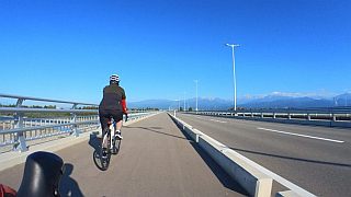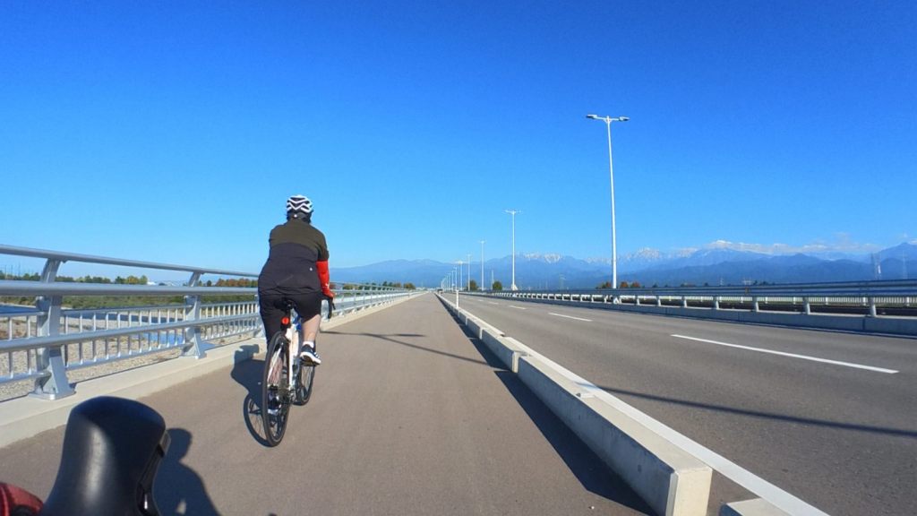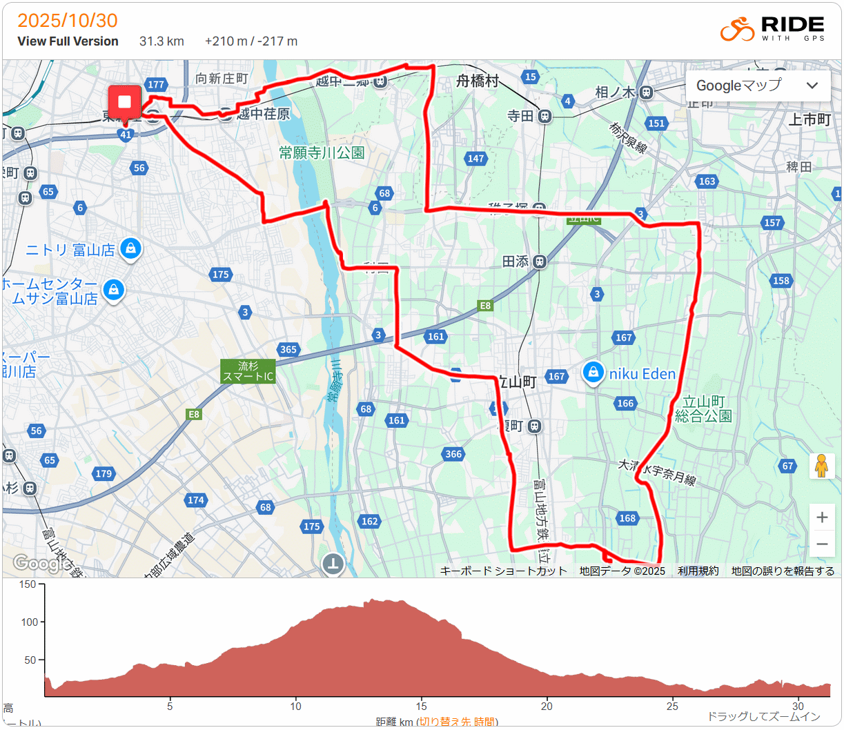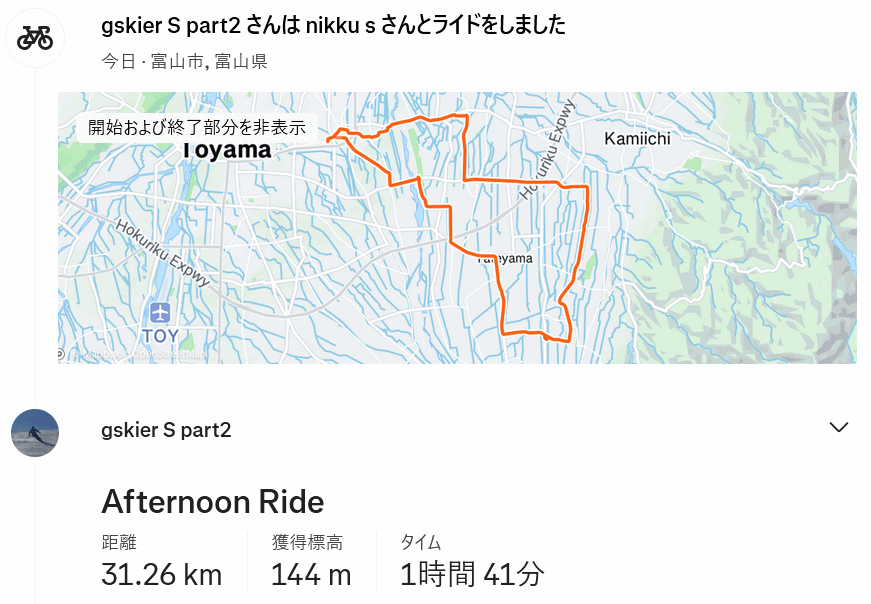 カフェ・アンシ●ンテ 30km 2025年10月30日 子どもがお世話になってるNPO法人が開業されたカフェに家内とロードバイクで行ってきた。富立大橋から利田小南側、五百石往来を少し走り、雄山中学付近から間道的な農道経由のほぼ最短距離で到着。営業終了間際なのに歓待頂き、オマケのシフォンケーキまで頂戴、こだわりのコーヒーは美味しかったデス。帰路は農道金剛寺からK6、舟橋村を経由して上市往来から帰宅。昨日初冠雪観測の立山連峰が綺麗だった。しかしウェアに失敗、もう少し暖かい服にすれば良かった…まぁでもウィンドブレーカー持ってったので何とかなった。今年の秋は涼しさが無く、暑さから寒さに一気に変わった。ジョウビタキの声やカラスウリの赤さに晩秋の寂しさ…。 |
