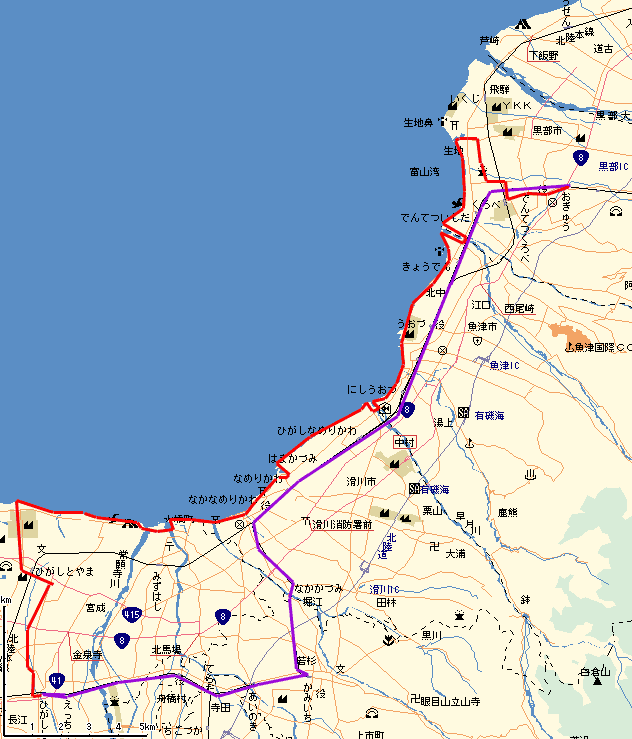 荻生→黒部→生地→石田→経田→魚津→滑川→高月→水橋→浜黒崎→岩瀬→自宅