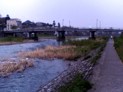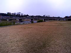 (16)再び河川敷へ 御影大橋を渡ればすぐに河川敷に復帰。前方の橋の名称は知らず。 |