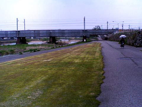 (17)JRの橋 雨がひどくなってきた。前方の自転車は二人乗りの傘差し運転…補導しますぞ |