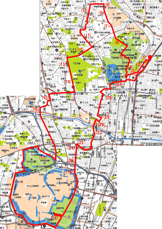 コースは、ホテル→上野公園→芸大→谷中・千駄木・根津→東大→後楽園→神保町→皇居一周→小川町→神田明神→池之端→ホテル。20キロくらい?でしょうか?