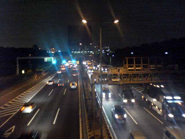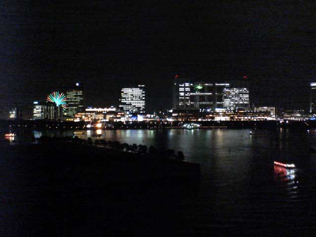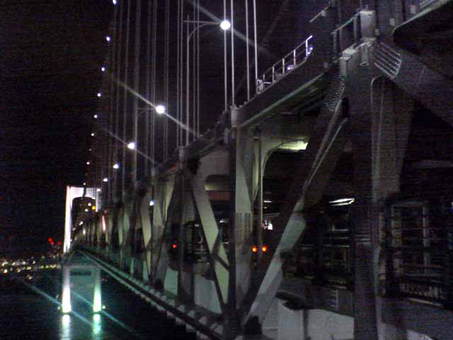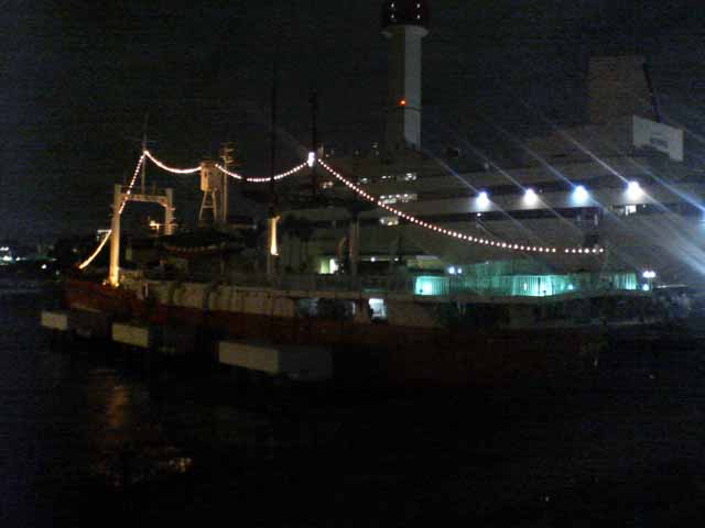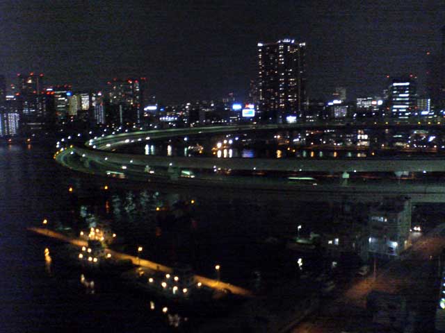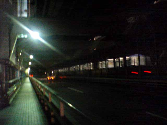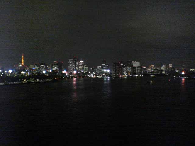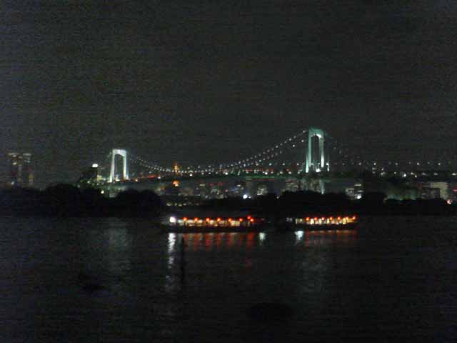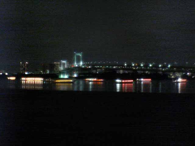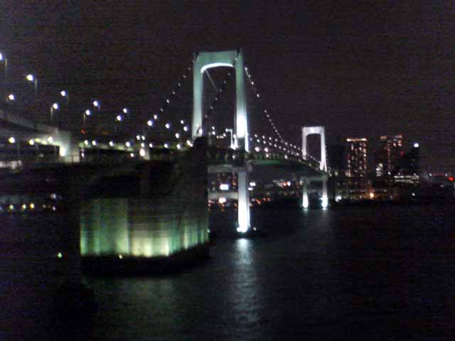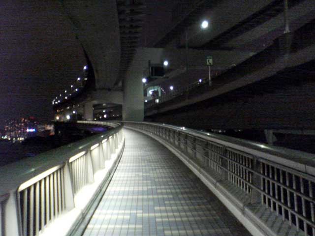 東京出張で再び夢の島のBumB泊、当初朝ラン予定であったが雨の予報。レインボーブリッジは夜8時半まで徒歩で入れるので急きょ夜JOGに変更、夢の島〜辰巳〜東雲〜有明〜台場〜レインボーブリッジ往復〜台場を周遊した。辰巳〜東雲あたりは人口が増えて賑やかになってきた。レインボーブリッジ往復もすれ違った人は一人。芝浦側にデート中の男女が1組のみ。今回左側通行でサウスロード〜ノースロードとしたが、景色的には右側通行のほうが良いだろう。復路はビッグサイト前の道路で新木場まで戻ったが、運輸会社が多くトラックの排気ガスが半端ではない。R357も交通量が多く、ジョギングコースとしてはつらい。センタープロムナードを使い、有明からは同じ道を戻るべきであった。夜の撮影、ケータイ内蔵カメラではノイズが我慢の限界を超えていた。本日のコース、コンビニの寄り道入れて約21km⇒