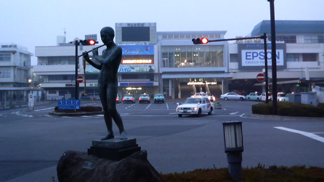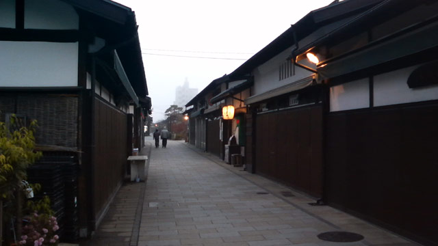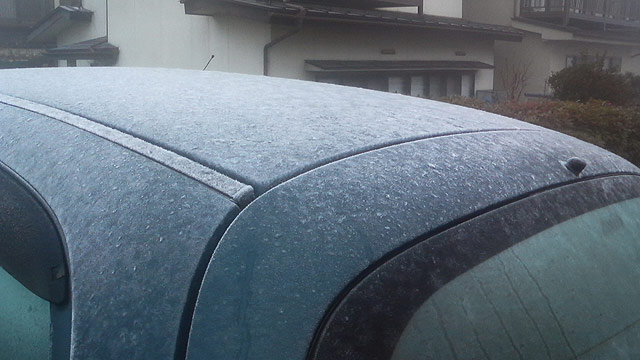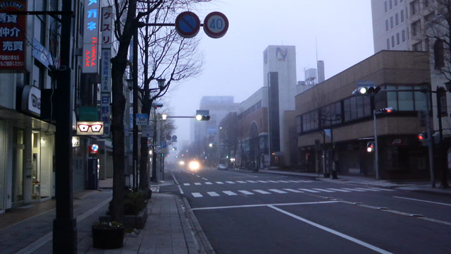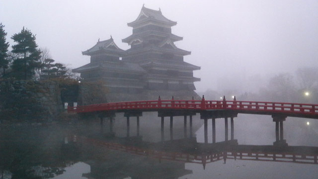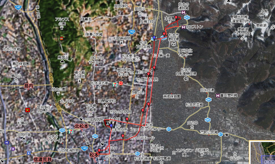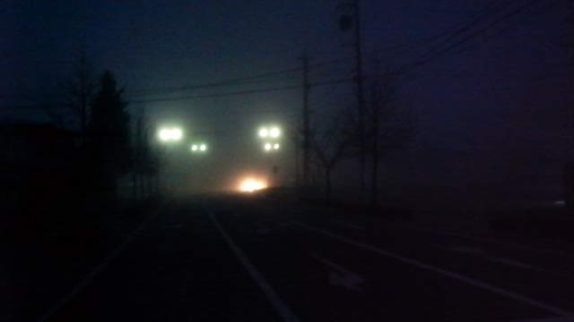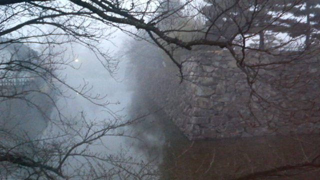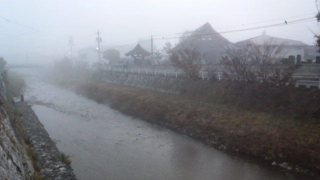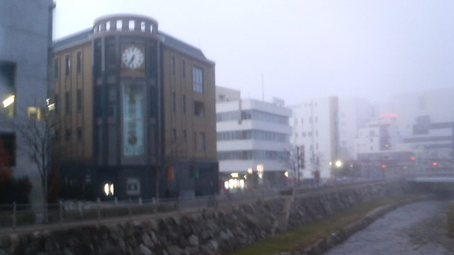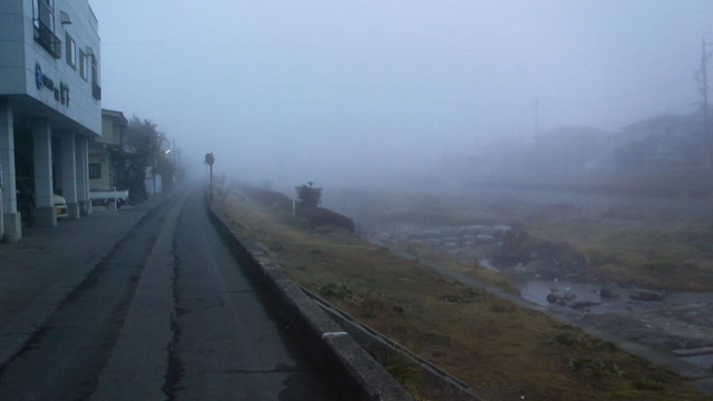 家族旅行で浅間温泉泊、5時前に起床するも真っ暗で躊躇、山の端が判別できるのを待ち6時前に出発。上弦の月が青い。氷点下2℃くらいか? 車に霜がびっしり降り窓は氷結していた。明るくなるにつれ霧が深くなり月が隠される。事前計画無しのためとりあえず松本城へ。幻想的だが寒い。市街を適当に走って松本駅で折り返し女鳥羽川左岸で帰る。信州大学近辺は霧が一層濃く、いろいろなオブジェが突然現れる。宿に戻って子どもを起し入浴。かじかんだ手にお湯が痛いけれど生き返った。松本は来る度に大変化。道は拡幅され、六九商店街のアーケードは消え、開運堂・花時計公園・縄手通りも立派になり…変わらないのはお城だけ。本日のコース、ウロウロした分を入れれば約12km⇒
