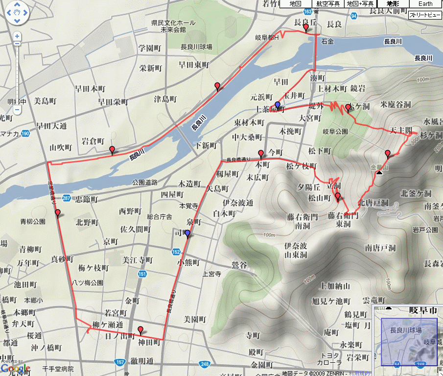 家族旅行で岐阜市泊。右股故障中であるが、ビッグクラブぎふ長良川走ろう会のホームグラウンドを走らない手は無い。高橋尚子も走った長良川、心肺脚力同時に負荷を掛けられる金華山トレイル、シャッター通り化したとは言え市内髄一の繁華街柳ヶ瀬と見所走り所満載であった。今回のトラブル? microSDカードを忘れて携帯本体のメモリーに入る画像しか撮影できなかったこと、何とホテルの玄関が朝7時開錠でワガママ言って6時に開けてもらったこと…。<本日のコース> 柳ヶ瀬通西端のホテルから忠節橋へ、長良川右岸の高橋尚子ロードを長良橋へ。左岸に渡り、川原町の古い町並み〜岐阜公園、馬の背登山道で金華山を登り岐阜城、七曲登山道から下山、長良橋通りから、柳ヶ瀬本通東端〜柳ヶ瀬ブルース歌碑〜ホテルに戻った。 本日のコース地図、標高差無視で12km弱⇒