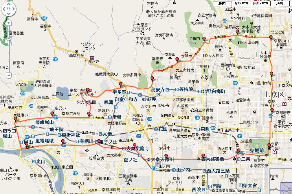 堀川通→二条城→押小路通→御池通→三条通→嵐山→丸太町通→山越通→一条通→仁和寺→(観光道路あらため⇒きぬかけの路)→金閣寺→北大路通→堀川通