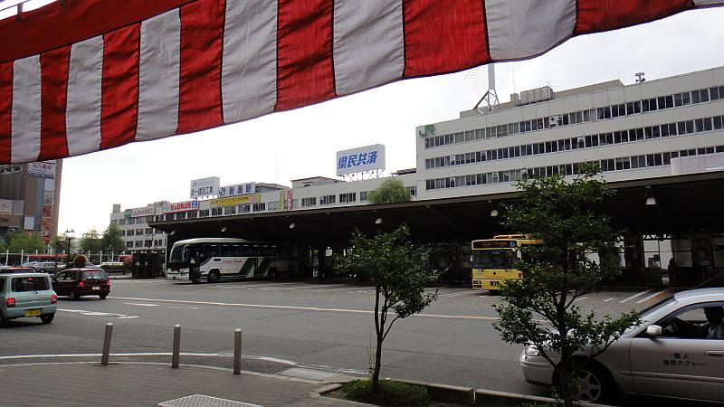 新潟駅前を出発。 紅白の幕は週末の新潟まつりの飾り付け。