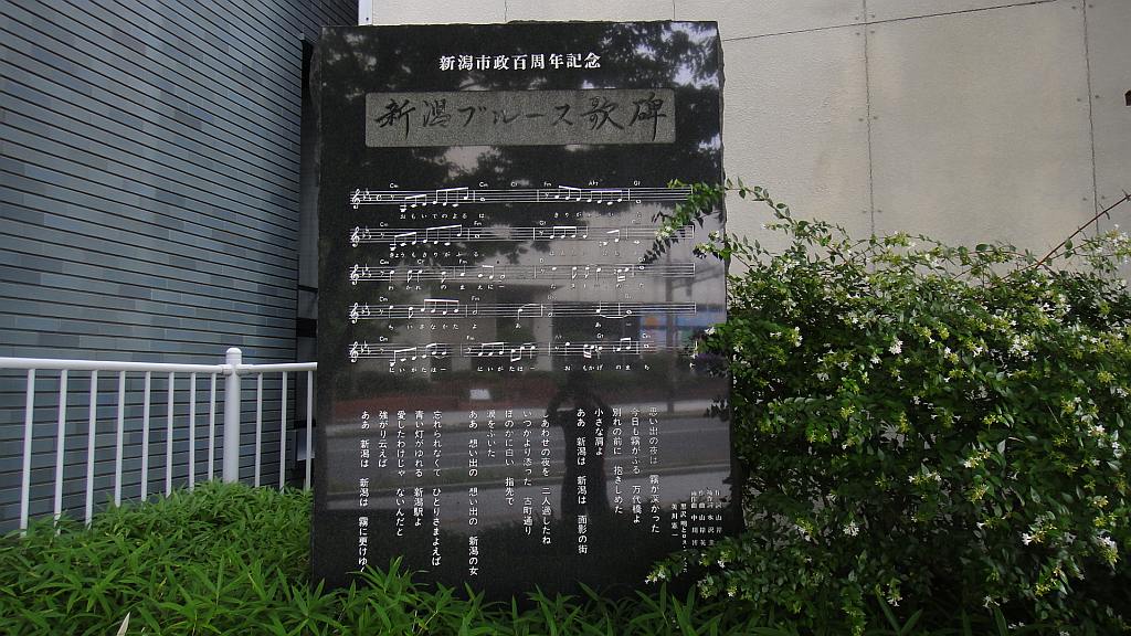 左岸橋詰の新潟ブルースの歌碑。 悲惨な扱いの 柳ヶ瀬ブルースとは違う(笑)。