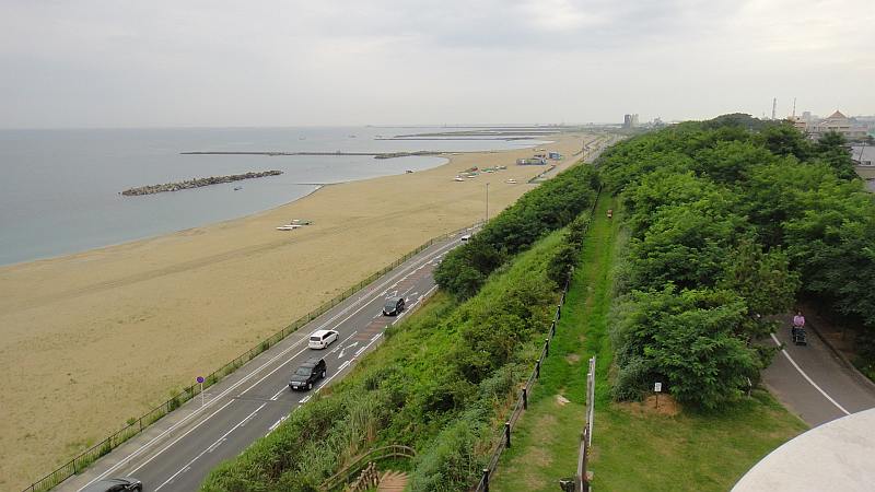 日和山の海水浴場、左の道路は新潟シティマラソンのコース、右は自転車道。