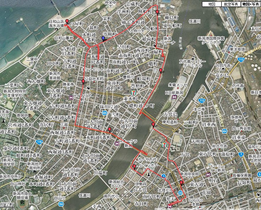 駅前のホテルから弁天通、ガルベストン通で万代シティ、やすらぎ堤に出て万代橋から柾谷小路を北上、古町で右折、シモフルへ。日和山展望台、下本町を少々覗き、みなとぴあ、柳都大橋、流作場五差路、東大通、ホテル。約10km。
