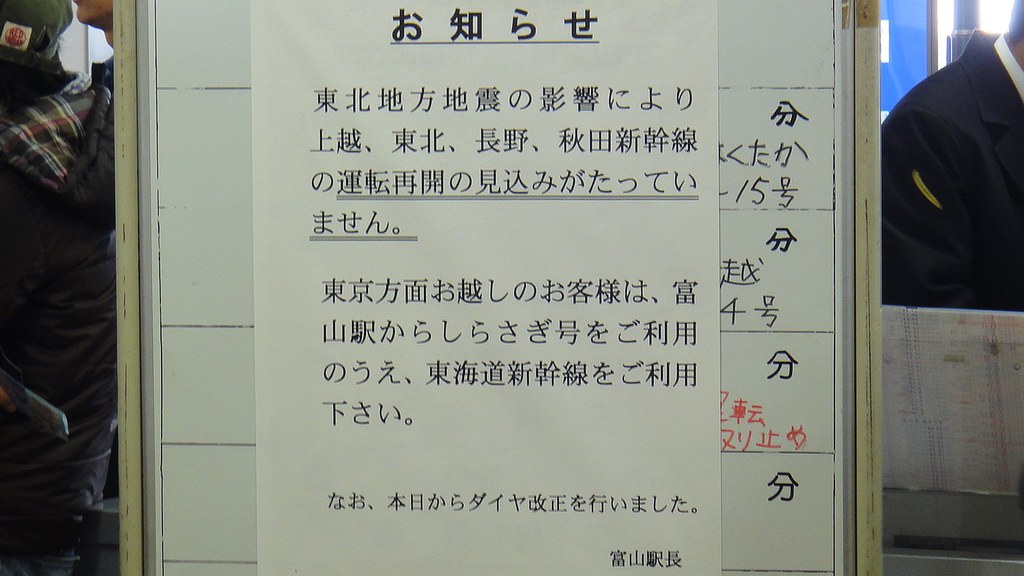 〔東日本大震災〕 あれから10年、あの日、何をしていましたか? 2021年3月11日 自分は1泊2日の東京出張2日目に地震発生で帰宅難民となり、その時の状況はテキストファイルとして残していたのだが、被災地の方々の艱難辛苦に比べるとあまりにも軽々しい内容で、家族や職場以外では語るに語れずであった。10年経って、あの時を振り返り記憶を伝える動きが少なからずあり、それに同調したわけでもないが、それなりに強い衝撃を受けた自分自身の記録としてまとめてみた。震災当日の行動や翌朝の寒さもよく覚えているのだが、12日に乗ったANA羽田富山883便の窓からの眺めが忘れられない。その時の思いは今でも明瞭に憶えている。飛行機が離陸すると美しい日本の国土が見渡せ、大震災や大津波が夢か嘘の様に思えた。富士山やアルプスの山々は人間が何人死のうが助かろうがいつも変わらず聳えているのである。帰宅して家族の安堵した顔を見て、自分に出来ることは自分自身や家族が健康に生活できる様に、小さな身の回りの世界をいつも通りに動かすことしかないと認識。そして、災害の度に思い出す良寛様の言葉、「災害のときは災害に逢うが宜しく候」である。 ▼3月10日(木) 1泊2日の東京出張。富山駅構内に入ると平日の朝6時半なのに撮り鉄がちらほら。明日で北陸本線から引退する419系(583系改)が入線していた。北陸で顔をぶったぎられ何とも可哀想な姿に成り果てたが昔は憧れの寝台特急であった。さらに、明日で国内通常運行ラストとなるキハ58・28系まで居た。キハ58が国鉄急行「ひめかわ」として現役だった学生時代は帰省時によく乗った。まだ電化されていない越後線で、内野から新潟駅に出ることなく直接西に向かえたし、終着の青海駅で富山行きの普通列車に連絡しており、特急利用と乗車時間はそう変わらなかった。はくたか1号に乗るとすぐに車内アナウンス、上越線のトラブルでほくほく線経由の越後湯沢行から信越線経由で長岡行に変更、東京着は30分以上遅くなるものの、おかげで久々に上越〜長岡の車窓からの景色を見られた。中越沖地震の爪痕残るも、柏崎の海岸や長岡の山間の景色は何とも懐かしく、はくたかにこのまま第二の故郷である新潟まで走ってくれないかと・・・時折響く汽笛もエレジーの様だった。 東京は馬鹿陽気でスギ花粉大量飛散中、鼻水爆流+目の痒みが酷い。中央線四ツ谷から丸ノ内線で赤坂見附へ、出張初日は主目的の東京支社のLAN設備更新、10年物の古い10メガHUBやら勝手増設の小型HUBの撤去更新、LANケーブルもカテ5eに更新、ツメ折れた端子の更新圧着やらと意外と作業多し。後片付け後、N部長にコールドスタンバイのレクチャー&細々した相談に応えつつ、ちょうど東京出張してた別部署の社員と一緒に誘われた会食を断って、午後6時前に支社を出る。見附から赤坂を少々ぶらつき千代田線で日比谷、アートスポーツ日比谷店でシューズ物色、買うなら明日でいいかと冷やかしだけ。八丁堀の常宿泊。 ▼3月11日(金) ゆっくりの朝食後、10時ちょい前チェックアウト、京葉線で新木場駅、りんかい線で国際展示場、ビッグサイトでセキュリティショウ、昨日の作業の予備日を兼ねてオマケで付けた用事ではあるが、折角の上京で見聞広めることは悪い事ではない。ICカードや携帯電話使ったハンズフリー入退館システム、暗視化やHD化またIP化された監視カメラ、これらを統合した中央監視等の情報収集。午後早々に切り上げ、移動を除けば2日間の予定は終了。移動販売車の弁当で昼食安上げて、東京駅へ移動。帰りの新幹線まで2時間ほど。荷物を職場の携帯からコンデジの果てまでぜんぶ東京駅のコインロッカーに預け、有楽町駅から日比谷へと向かう。 ▼3月11日(金)14時46分〜 急に眩暈を感じ足元がふらつく気がした。が、周囲の悲鳴で眩暈ではなく地震の揺れと気付く。揺れは一気に強くなり、信号機や街灯の支柱が有り得ない角度で左右に振れている。足元を見れば地面が波打ち、踏ん張って立っているのが精一杯でまったく動けない。オートバイから降りて必死にバイクを支えている人もいる。足元ではアスファルト舗装とコンクリートの継ぎ目が開いたり閉じたりしている。とても長く感じた揺れが収まってから建物の無い皇居方面へと急いで避難する。 皇居上空には沢山の鳥鳥鳥…、こんなにも皇居に鳥が棲んでるのか。パトカーや白バイがサイレンを鳴らし走っている。丸の内の建設中ビルのてっぺんでクレーンが大きく揺れワイヤーが不気味にゆっくり大きく振れている。東側の海岸方向では火災と思われる黒煙が立ち上がっている。状況を知りたいが職場のワンセグ付き電話はかばんごとロッカーの中、持っているのは電話機能しかない個人携帯・・・。ワンセグTVを見ている人に聞けば、東京の震度は5強、てっきり東京直下地震と思い込んでたが、震源は宮城沖とのこと。各地の様子は不明。報道のヘリが何機も飛び始める。余震の危険もあり、しば