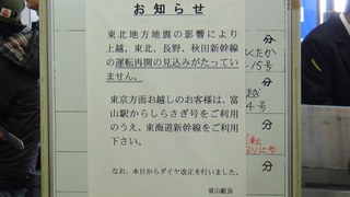 以上が、自分のあの日である。本当は書きたくても書けないこともあるのだが、それは自分の心の中でだけ…。なお、帰宅困難となり出張が1泊1日増えただけで被災はしていない。しかし巡り合わせなのか、何故か県外に居る時に大地震が発生する。2004年10月23日の中越地震時も東京出張、この日は帰りに1本列車を早めたおかげで直撃を免れた。購入当初の切符は脱線したとき325号、それに乗っていれば越後湯沢で下車のため脱線には遭わないものの当日の帰宅は無理であった。地震発生時は乗車した特急はくたかが直江津〜糸魚川間で暫く停車、少々遅れただけだった。2007年7月16日の中越沖地震では地震前日に妻子とズバリ震源地である観音崎近くで食事をとっており、地震発生時には新潟市に居て救われた。とは言え帰路の国道8号と北陸自動車道ともに通行止となり、延泊&群馬長野白馬からの大迂回で戻った。東日本大震災後では、2014年11月22日の長野県神城断層地震には家族5人で上諏訪のホテルで遭遇、翌日は白馬経由で帰宅予定であったが国道148が崖崩れで通行止、安房トンネル経由で戻った。この様な幸運が続いているが、全くの無事では無いものの、災害が他人事では無いそれなりの経験は記憶として大切にしたい。 >HOMEに戻る|>戻る |