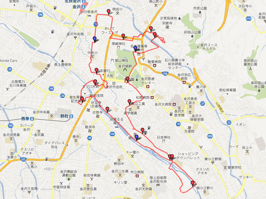 故障中であるが徐々に距離を延ばし始めた。金沢での用事終了後に久々に犀川沿いをジョギングしようと、大桑の楽ちんの湯に車をデポしスタートするが犀川雪見橋からの右岸は工事中、気が変わり市街へ。適当に足を進め、笠舞本町から菊川、幸町と古い街筋を通り、大乗寺坂から石引へ。ここから観光モードに入り、本多の森、広坂、百間堀、白鳥路、大手町を抜け鏡花の道から梅の橋で浅野川を渡り秋声記念館、観音院参詣後、ひがし茶屋街、自由軒すぐ近くで天然記念物の捕り物騒動、浅野川大橋から主計町茶屋街、くらがり坂を上り鏡花記念館、蓄音機館前から尾張町商店街、博労町から近江町市場、武蔵交差点から安江商店街、東別院、別院通(ふらっと通)、金沢駅をちら見し、リファーレ横から玉川公園、大野庄用水沿いから長町、武家屋敷群を抜け、鞍月用水沿いから香林坊柿木畠竪町へ、片町裏の新天地と中央味食街、新橋から白菊町、にし茶屋街で三つ茶屋街コンプリート、雨宝院前を通り、犀川大橋、犀川縁に下り、ひたすら上流へ向かいゴール、楽しかったデス。