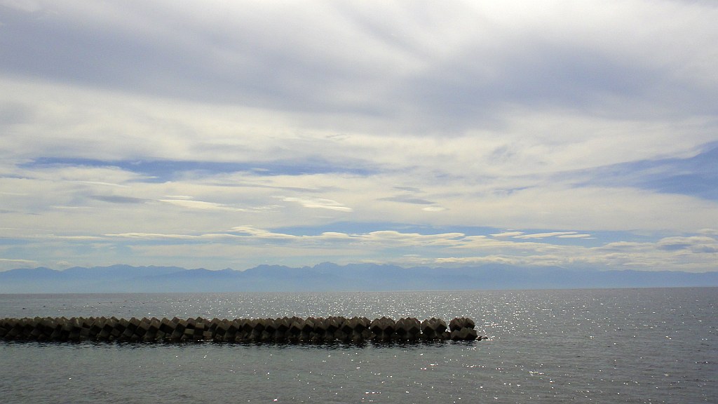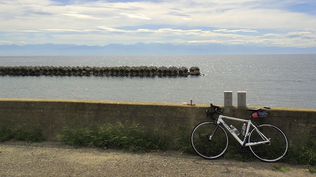 県境、前輪が七尾市、後輪が氷見市。立山連峰が見渡せた。 富山湾岸ウルトラマラニックのゴール地点、変な思い入れと思い出がある自分には特別の場所である。