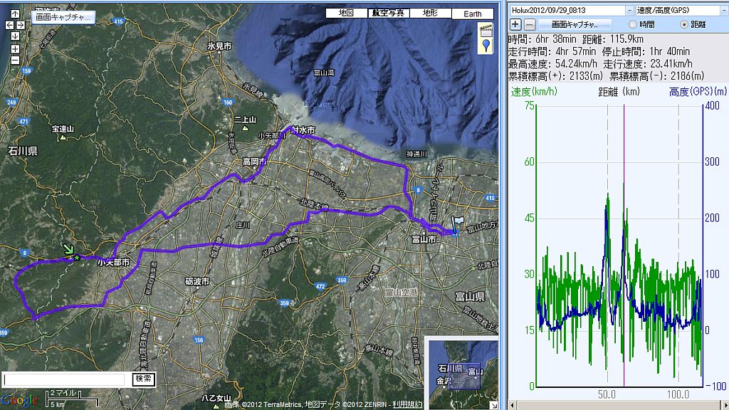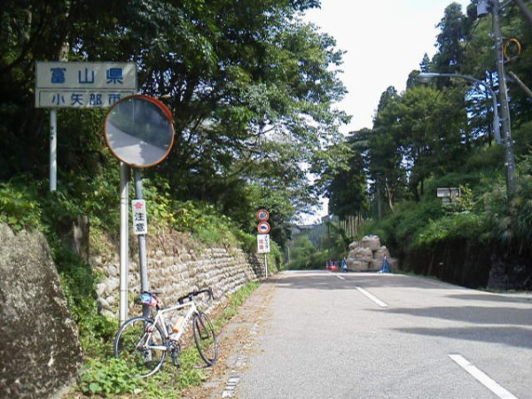 県境の町その4(石川県金沢市)その5(石川県津幡町)120km (2012.9.29) 県道9号でkoba先生の常国から中田橋を渡り戸出、小矢部の柳原からクロランドおやべで休憩、小矢部IC前からR359で内山峠に取り付き、スノーシェッドで金沢市、石川県道212はジェットコースター11%の下り、旧8倶利伽羅道の駅で休憩、天田峠をダンシング、県境で写真を撮ってると、ランナーから挨拶(いたち川のTシャツのせい?)、さらに富山側から上がってきたローディにも挨拶を頂く。小矢部市街まで40km/hオーバーで気持ち良く下り、県道236(所謂旧街道)で福岡〜高岡の街道沿いの風情ある街並み、まじまの十段ソフトで休憩、庄川河口から新湊、県営渡船は運悪く30分待ち、新湊大橋は大賑わいで車列が続いていた。海老江の旧道と四方からは射水線跡を走り、富山市へ帰還。