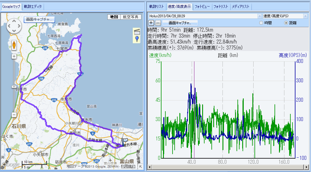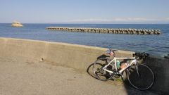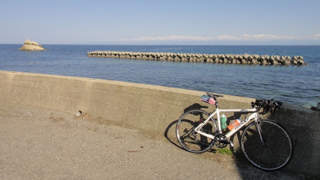 6ヶ月ぶりの宝達志水町から名も知らぬ農道を使い羽咋市内へ。千里浜は観光客が多そうなので近寄らず、たなべ駅前店は休業、R248沿いボウリング場廃墟前のコンビニで補給。当初予定より1時間は遅い。コンビニの洗面所鏡に映った穴の開いたジャージ姿が情けない。ヘルメットの下の手拭いを締め直しスタート。猫の目から県道2号へ。強い追い風区間に入り一気に七尾市内へ。七尾港で写真を撮り公衆トイレに寄ってすぐに崎山半島へ。三室の山間部から鵜浦への新しい道が開通している。鵜浦漁港で補給休憩、立山連峰だけでなく妙高方面、北アルプス中南部の山々まで見渡せる。風が傷に滲みる。観音崎側にわざわざ回り能登島に別れを告げてから氷見を目指す。風は向かい風に変わり気合でペダルを回す、左膝に軽い腸脛靭帯炎の痛み。R160で相当へばってるロードレーサーに追いつく(balbaの300km走行で遅れた人?らしく、庵でbalbaのチームジャージが待っていた)。県境で撮影休憩中、彼等が乗った自動車(何故?)に追い抜かれる。九殿浜の登り手前で路肩の彼等を追い越し氷見漁港。補給休憩。立山は当然ながら灘浦からよりも大きく見える。