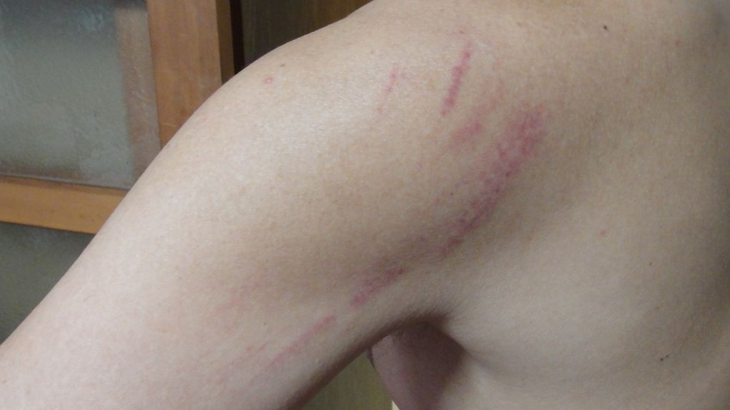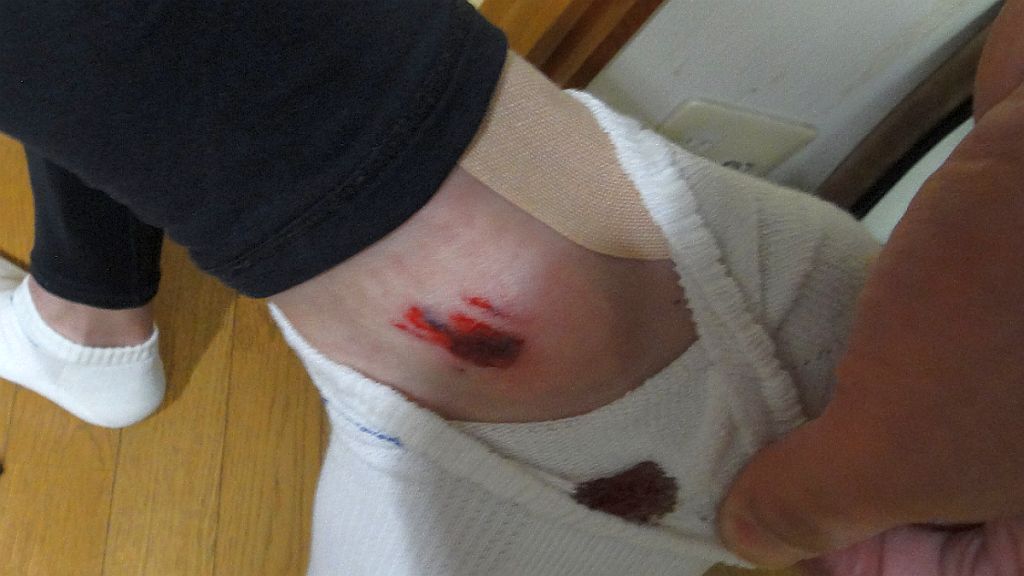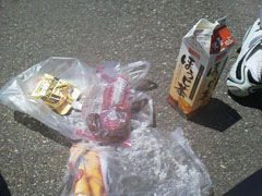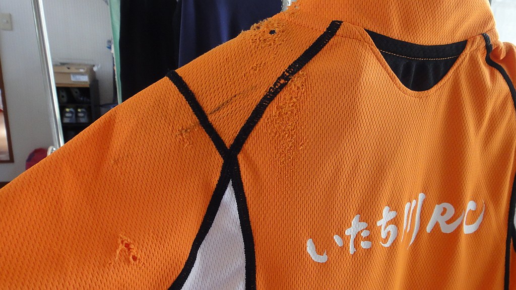 落車負傷・高岡羽咋七尾氷見175km 2013年4月28日 グランフォンドの距離練習でオーバー170kmを目指す。今日はマラソン大会の魚津、チューリップフェアの砺波を避け、高岡→羽咋→七尾・崎山半島→氷見。約30km地点の国吉のローソンで休憩、県道29のヒルクライムに備えて二枚重ねの長袖を一枚脱ぐ。強い上り坂で体重増を実感、赤毛トンネルを抜け一旦停止しライトオフ、再び走り始めサングラスを外していたことに気付き、ジャージのポケットに視線をやりサングラスを右手にもった瞬間、路肩の砂に乗り上げノーコン状態で側溝とガードレールの端が迫る。落下も衝突ももしもの後続車に轢かれるのも嫌で自ら左に落車・・・酷い傷みに呆然としつつ、側溝に落ちなかった事は幸運と思うしかない。左肘左でん部左くるぶしに擦り傷を確認。肘とくるぶしの出血が多い。人家も疎らな山の中、とりあえず人里まで下ろうと再び走り出すも、傷に風が滲みて痛く寒気がしてくる。寒気は良くない兆候と、家内にどこかに迎えに来てもらうべく電話するか・・・とサイクルジャージのポケットを探ると電話と財布が無い。転倒地点で落としたらしい。約2km転倒地点に戻るとあったあった。しかし包んであった袋はズタズタ。電話は傷だらけでストラップも引き千切れていた。↓初着用でズタズタにしてしまった(涙)