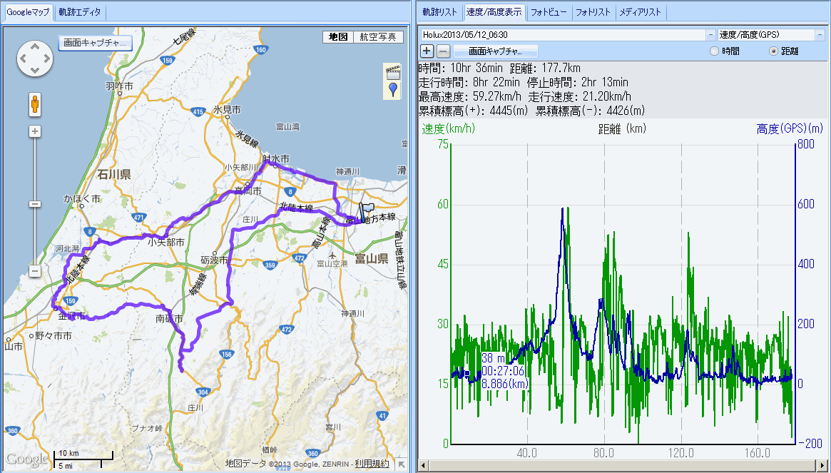 五箇山トンネル入口→金沢→津幡→高岡 183km (2013.5.12) GF富山の練習、本日は本番並みの距離と坂少々。五箇山トンネルまでの上り坂はやはり超絶にキツかった。新川育成牧場や東福寺野なんてカワイイものである。昨年はインナー23Tで上がれたが今年は25Tでやっとやっとであった。福光から県道27で金沢へ。角間キャンパスを抜け、兼六園に行くとやたらとランナーが多い。聞けば利家とまつリレーマラソン開催とのこと。河北潟から津幡へ、中津幡の森乃庵で昼食、美味い。天田峠で県境、倶利伽羅不動尊から走り降りてきた女性ランナーに声を掛けられる。彼女たちは小矢部側までロードバイクで来て不動尊までランで往復したとのこと。一気に駆け下り、小矢部から福岡へ。風の予報が外れて福岡市内で何故か向かい風に。左の腸脛靭帯が痛み出す。何とか堪えて、まじまの十段ソフト、今度は男性のローディ二人から声を掛けられる。南栃と高岡の方々で砺波→山田→大沢野→上滝→水橋と回ってこられたらしい。先週はGF富山ロングの前半部試走もされたとのこと。向かい風に耐え新湊、兼営渡船今日は「こしのかた」だった。四方から桜谷までようやく追い風、帰宅し距離はメーター読みで180kmを超えていた。疲れた〜。