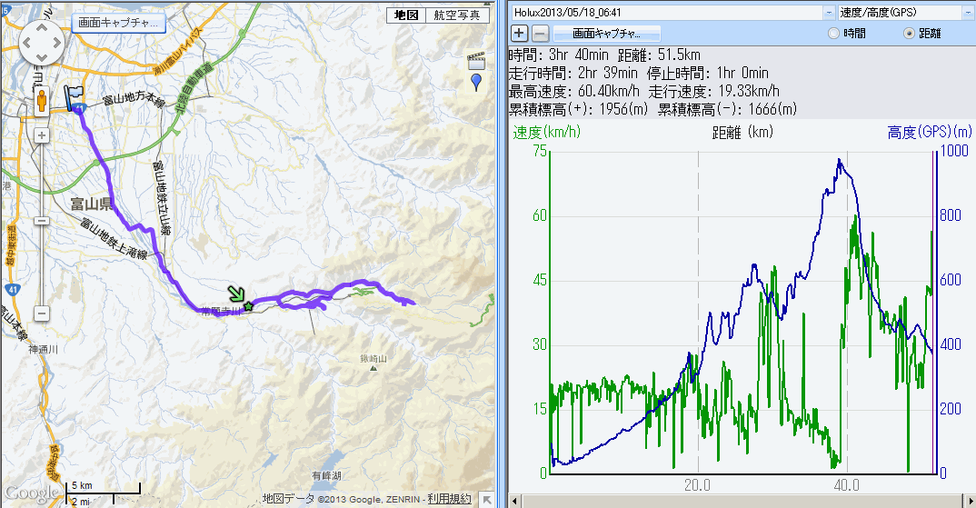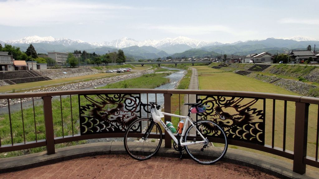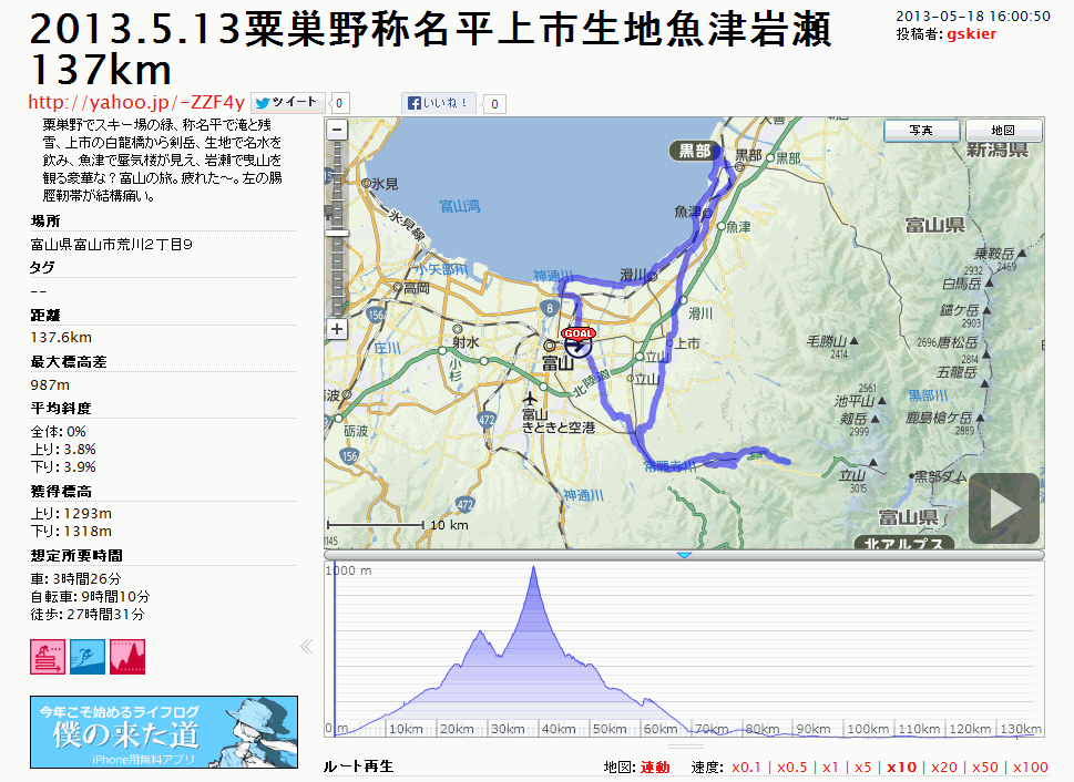 粟巣野→称名平→生地→魚津→岩瀬 137km (2013.5.18) GF富山の坂練習はそろそろ仕上げ?のつもりで、富山が誇る大激坂Max13%オーバーの「称名道路」へ。サンダーバードでおにぎり4個を購入し、まずは前菜として粟巣野スキー場へ。4月の漕ぎ初めに比べると坂耐性はそれなりに出来ている気がするが、ホイールがRS80なので本当に「気のせい」かも。立山駅に降りて朝飯兼ねた補給おにぎり2個+熊王の水。台湾人・タイ人らしき団体が続々とバスで運ばれてきて日本人が少ない。藤橋から桂台までは問題なかったが、やはり悪城の壁から先がキツイ。ラストのシェッド途中でついに敗北、自転車から降りて転がし歩きでレストハウスへ。しばし休憩後、ウインドブレーカーを着て下る。やはり激坂でブレーキ無しでは到底下りられない。芦峅寺手前でウインドブレーカーを脱ぎ、一気に岩峅寺。吉峰に上がり瀬戸から上市、上市川に掛かる白竜橋で剱岳を観ながら補給休憩おにぎり2個。ここから距離を稼ぐため滑川魚津黒部と走り魚の駅生地へ。湧水で補給中、安曇野から来たと言う方に話しかけられ変な長話。石田浜で蜃気楼発生を確認、魚津の海岸線に入ると見物客多数、海の駅蜃気楼は大変な事になっていた。魚津から岩瀬まで30km/hをキープしてみる。100km以上走った後での追い込みはキツイ。これが成果となるかただの無茶となるかは不明であるが、岩瀬でまーた左の腸脛靭帯が痛くなり、後者になる予感。岩瀬では曳山祭りの最中で少々見物。左ひざの痛みを我慢しつつ帰宅。 残雪と新緑の称名滝を観て、上市で剱岳を眺め、生地で名水を飲み、魚津で蜃気楼を眺め、岩瀬で曳山観覧となんとも贅沢な自転車での富山観光でしょう(笑)。残念だったのは我が体力、称名道路なんて不摂生な若い頃に14kgもあるクソ重い鉄のMTBで一歩も足も着かずに平気で上ってそこから滝までランニングで往復してたのに、MTBよりうんと軽いカーボンバイクでこれでは情けない。認めたくないが、これが30才と50才の肉体の違いの事実である。