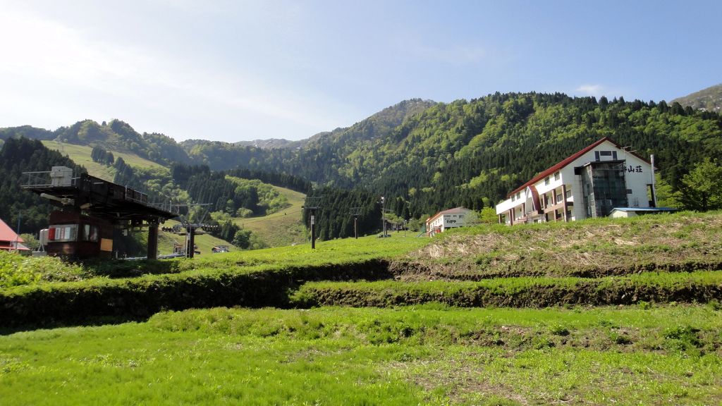 粟巣野スキー場 ゲレンデで山菜採りしてる方が何人かいらした。ロッジわがや前には宿泊者の車数台。